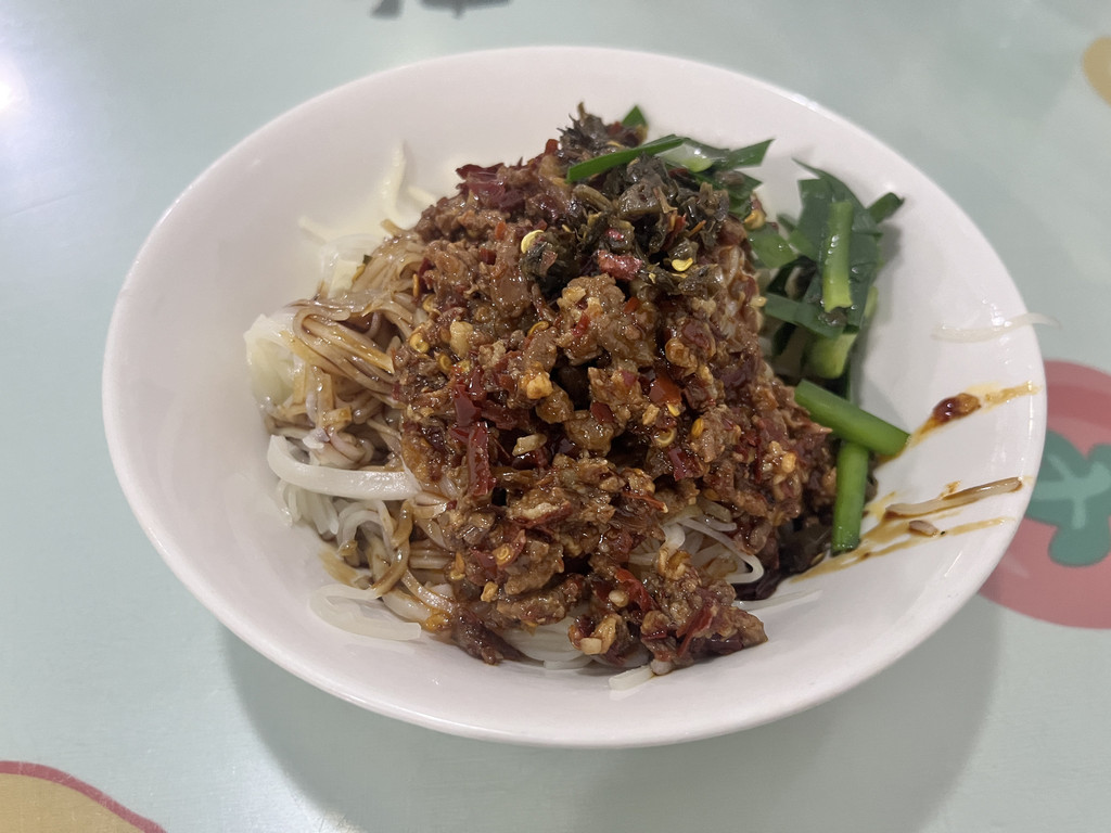 蒸饵丝,精华是盖在饵丝上的肉酱,在苏南叫“浇头”。用筷子拌一下,肉酱末切得相当碎,几乎纯瘦,很香、微辣、微酸。