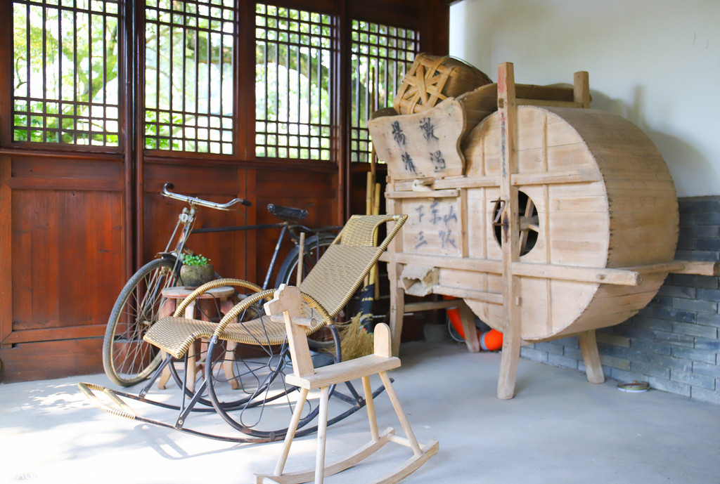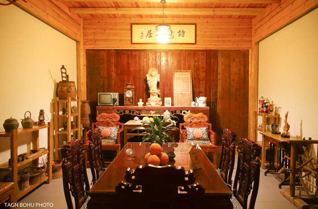 就在庭院的右手边有一栋客房,旁边有一棵树龄有500年的苦槠树,听说,这是以前古宅重新改造而成的民宿,房子的主人从小就生活在这里,庭院里陈列着各种传统农具,自行车、犁、耙、锄、水车等等,这对于民宿的主人来说又是那么熟悉的农具,以前的古宅也变成了现在焕然一新。