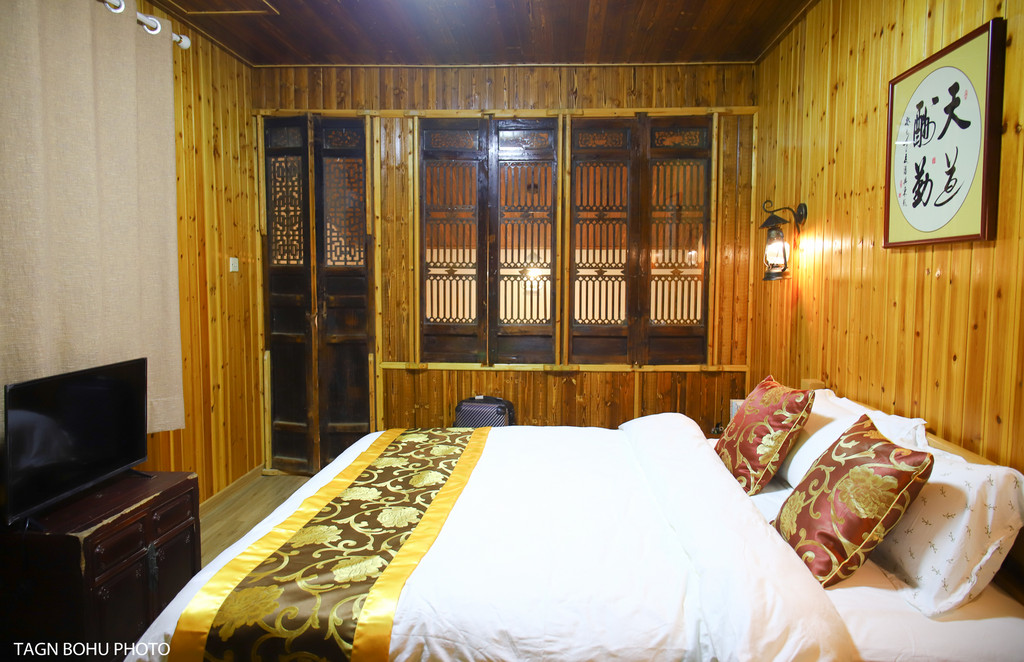 民宿一共有五个房间,内部装修还保留着古色古香的风格,具有年代感的木箱子,木门,木窗都重新翻新,各种房间里的摆件等等,房间里布置温馨,明亮的灯光,有电视,空调,沙发等等。在这夜晚里感受乡村的那份宁静。