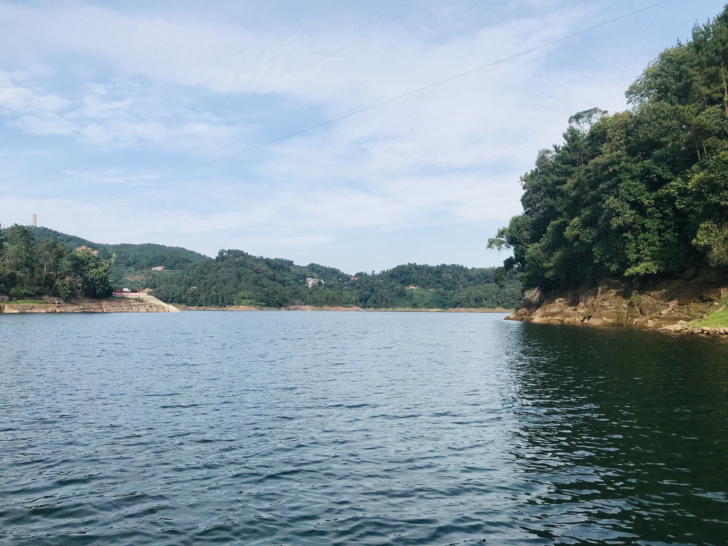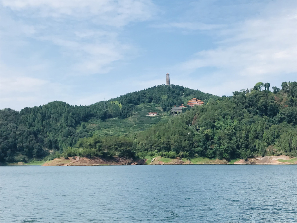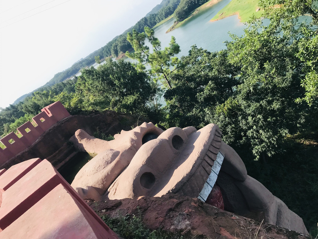 3.看点:(1)湖,这个水库挖的很大,是在原“黑龙潭”基础上扩建的。湖面波光粼粼,但没有水光接天,一个原因是因为本来Y字就不可能看起来像鄱阳湖或者洞庭湖,另一个原因是我是个老实人,不喜欢夸大“飞流直下三千尺”。传说黑龙滩有72个岛对应二郎神72般变化,为什么会和二郎神扯上关系,在之前游“泼水现字”说过了就不说了,船家说只有枯竭时候72个岛才能全部漏出,这是题外话。湖水碧波荡漾,掬起一捧清澈见底,近几年加大力度保护的成效果然明显,可以带个矿泉水瓶子装一瓶,这里是水源保护地了。这种保护的缺点在于,我本想坐个私人船,像在百丈湖那样,尽享湖水的清凉,但湖边农家乐全部没有这项服务了,惋惜。(2)报国寺,几年前第一次来的时候去过,上岛之后再走很有段距离才到,需要爬个不高的山。寺庙不大,有鸽子,一座塔矗立山巅,巍峨挺拔,但不能进去,纯当散步玩耍了。可以找当地人坐过摩托上去,省点体力。(3)蟠龙岛,收费的小岛,照片里那个像shaB一样挥舞双手的喜感充气人之所在,也是游湖船必经之处。他们串通好带你过去,然后到另一端等你,上岛下岛一条路走完,收你25的门票。岛上以前是猴山,并且是野猴,这是个乐趣的地方,但猴子伤人之后就关了禁闭,变成禁闭岛了。上岛只能看到笼子里的猴子,等于个小型动物园,而且只有猴子,配上粗糙的大龙头雕像,典型的坑。