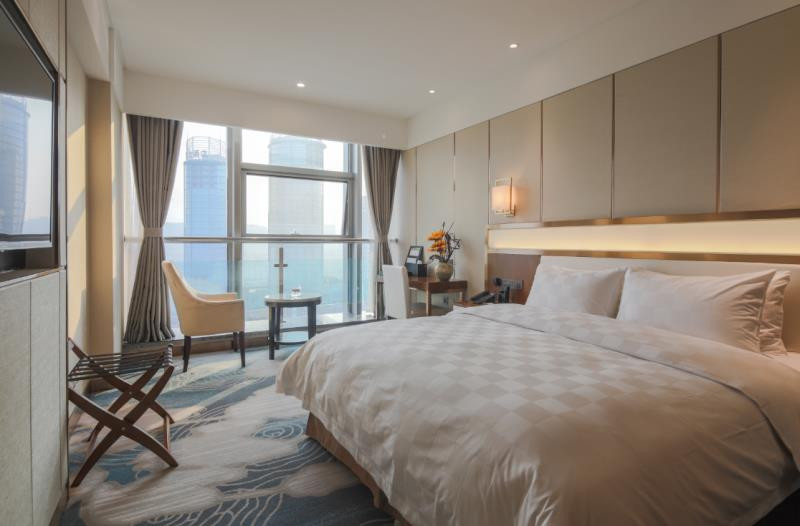 进入房间映入眼帘的是180度落地视景窗,可以更好地直面大海,观赏海边的景色,入住行政楼层还有饮品都是免费畅饮,来杯胶囊咖啡,坐在窗前,观赏远处的景色,惬意的生活不就如此而已嘛!入住期间会有迎宾水果赠送,酒店会根据不同的客人合理安排房间,在标准化的基础上实施个性化服务,尽可能地满足需要。全自动窗帘让入住更加便利,床品配备金可儿床垫和羽绒制品,可以提供乳胶枕、荞麦、决明子等不同类型的枕头,并且卫生间采用干湿分离,整体给人的feel很便利、舒适。