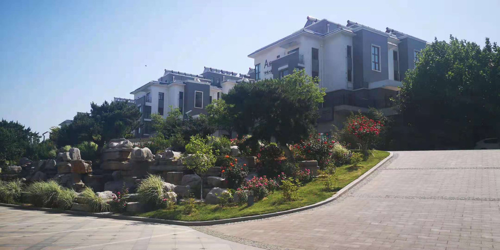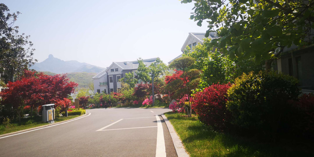 酒店道路两侧茂盛的树木郁郁葱葱,干净的路面,开心的行人形成了一副美丽的画卷。