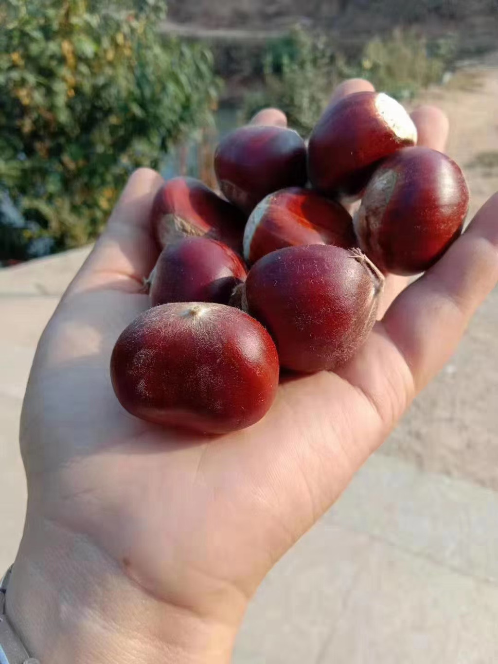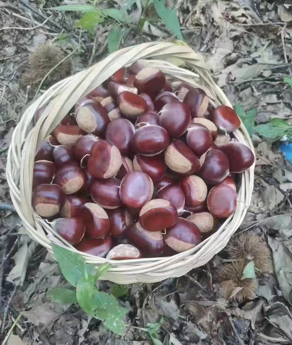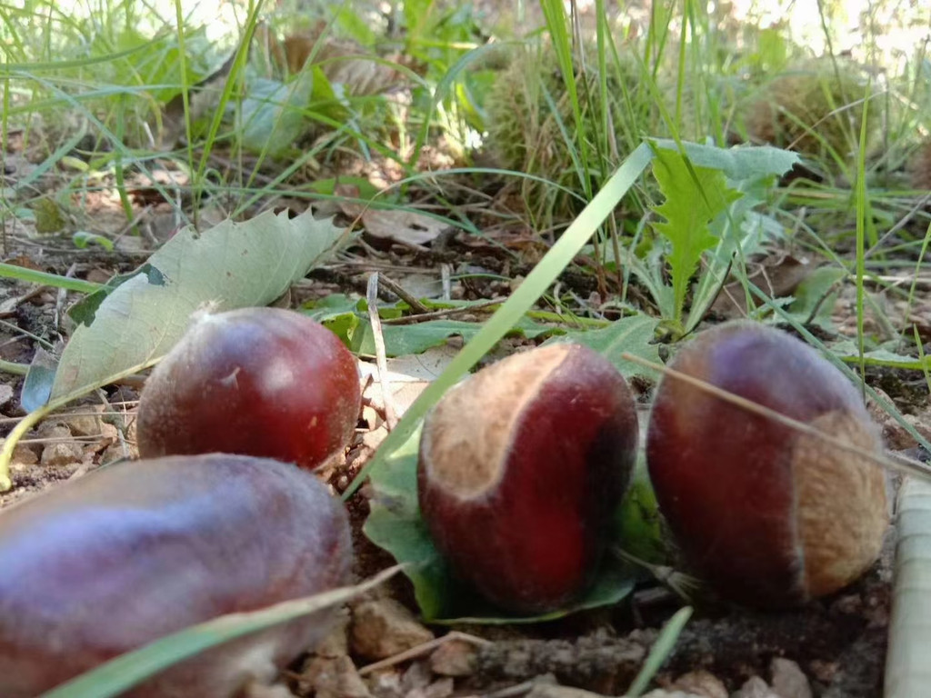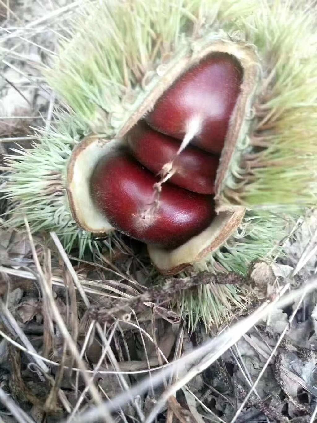 开始采摘了,大家分工合作,我们找来竹竿敲落果实,然后忙着捡满地的板栗。