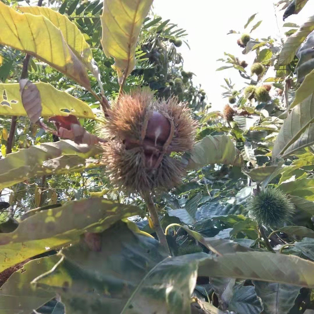 吃完午饭,我们来到了板栗园。高高的板栗树上挂满了一个个黄绿色带刺的小圆球,它们就像一只只缩成团的小刺猬。