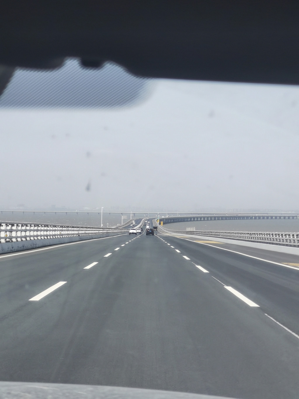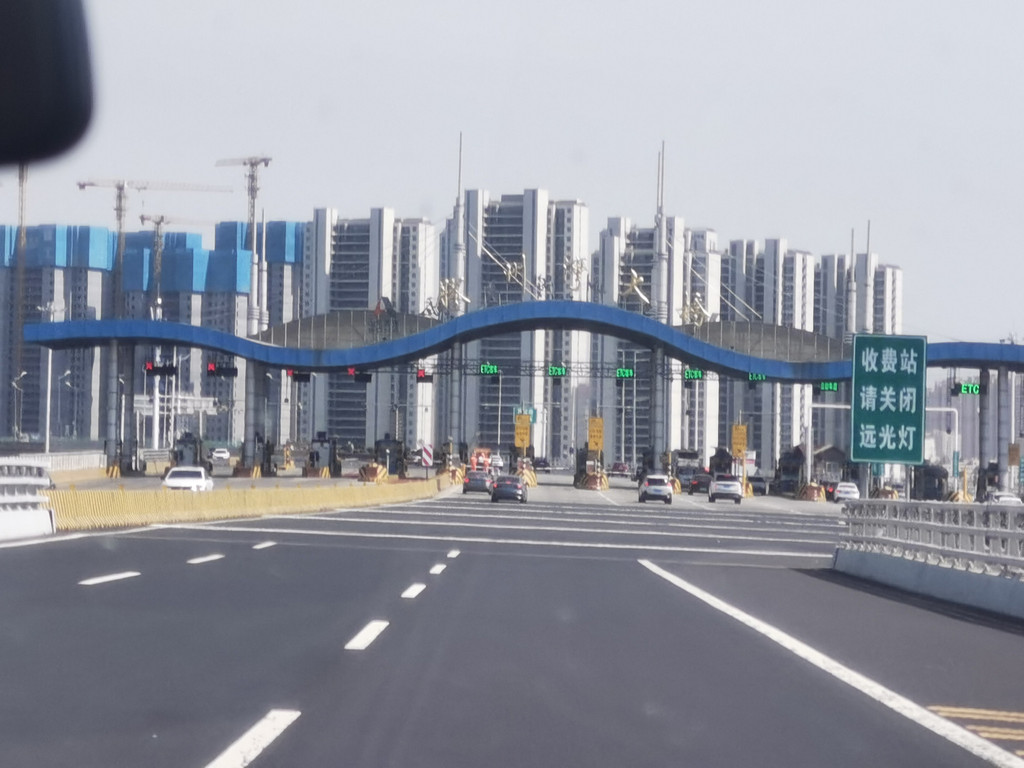今天海水的颜色都是浅灰色的,海浪挺大。2点03分到达胶州湾大桥收费站