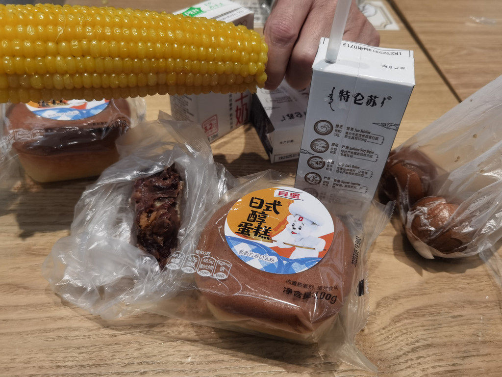 早上七点过,下楼不打算在酒店吃早餐,酒店早餐两人90块,感觉不太划算,就到外面逛,看到一家24小时便利店,买了两盒奶蛋糕,粘玉米,鸡蛋,粘豆包,一共38块钱。