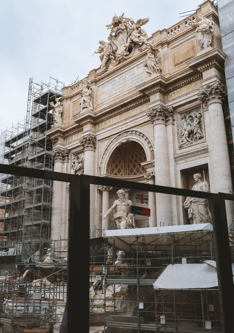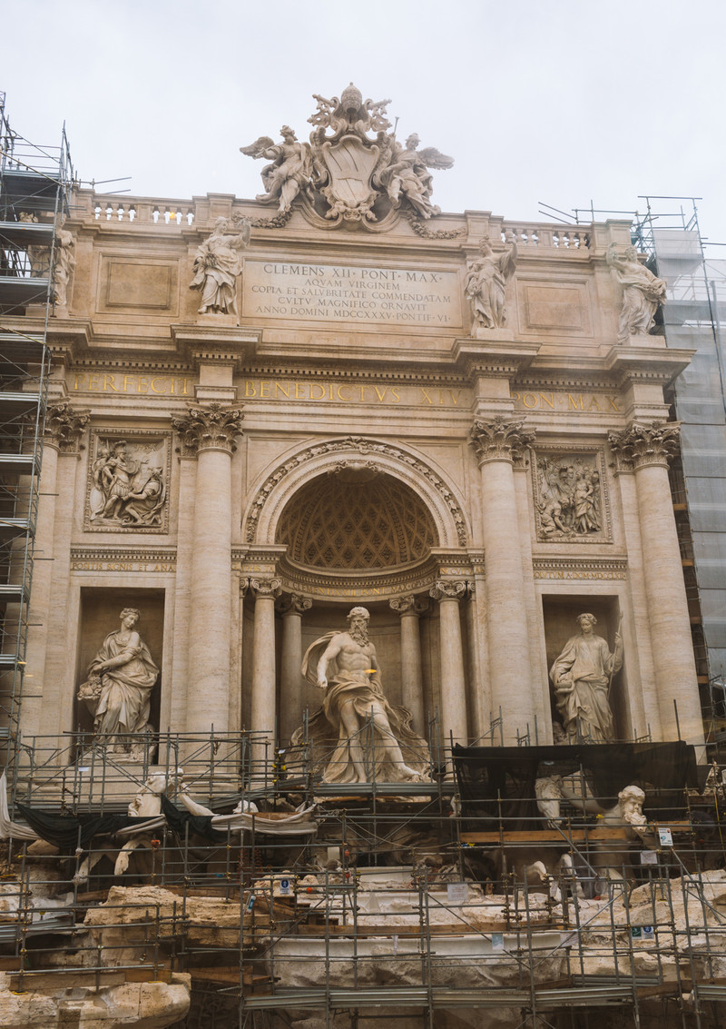 饭后雨越下越大,威尼斯广场的平台也不想上去了,会被林成狗吧。于是开始往有遮挡的小巷子里钻,去找特别期待的许愿池--特莱维喷泉。我们走到总统府时迷路了,看到路边有两警察,然后他俩一人给指了一个方向。。无奈只能自己打着伞研究地图,后来发现他俩说的都不对。。好不容易到了许愿池,居然在!维!修!而且修的完全没!法!看!意大利人还特搞在路中央挂了幅没维修时的许愿池照片,面前再弄一个小水池(洗手池?)让游客投钱许愿,我真是醉了。