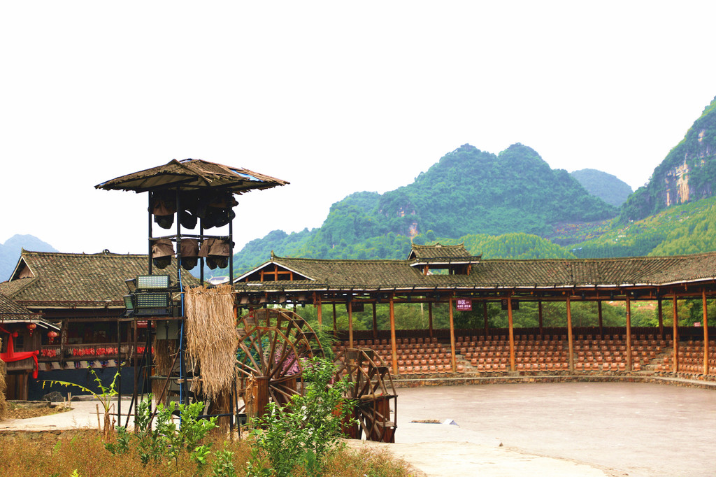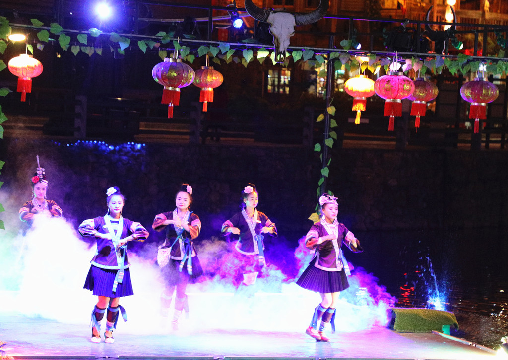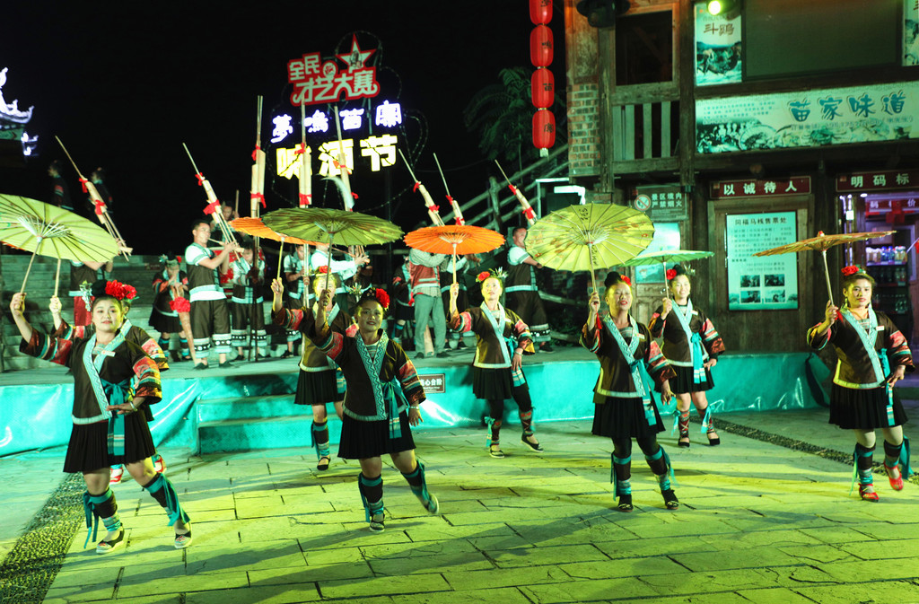 大型实景剧《苗魅》,每周五和周六晚上八点准时开演。演出地点所使用的苗族吊脚楼都是从贫困山区苗族村寨整体搬迁的木质房子,参与演出的演员除了景区工作人员以外,还有随房子一起迁入景区的贫困山区苗族同胞,共150人,其中易地扶贫搬迁户14户53人。苗寨民族风情街建筑均是从山里贫困村原封不动整体“打包”搬迁而来,最大程度保留了苗族原生态的建筑特色。这种新型模式会让苗寨越来越好。