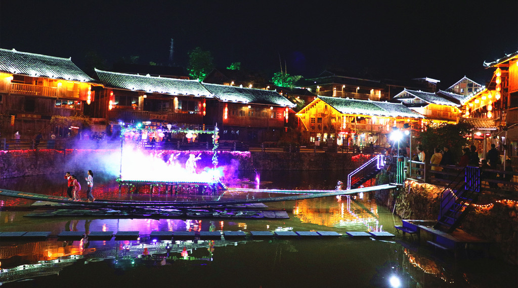 苗寨的夜色美轮美奂。每当夜幕降临,苗寨一下子变成了灯的海洋,光的世界。初冬时节,融水苗寨昼夜虽有一些温差,晚间要比白天稍微凉一些。但是,如此热闹的苗寨之夜,不觉凉意。几位漂亮的苗族姑娘,在水上搭建的舞台,跳着欢快的舞蹈。在武侠的前方,有一个网红吊桥,吊桥是在水之上,这个季节不敢去挑战,如在夏季,一定去网红吊桥挑战一下平衡力。