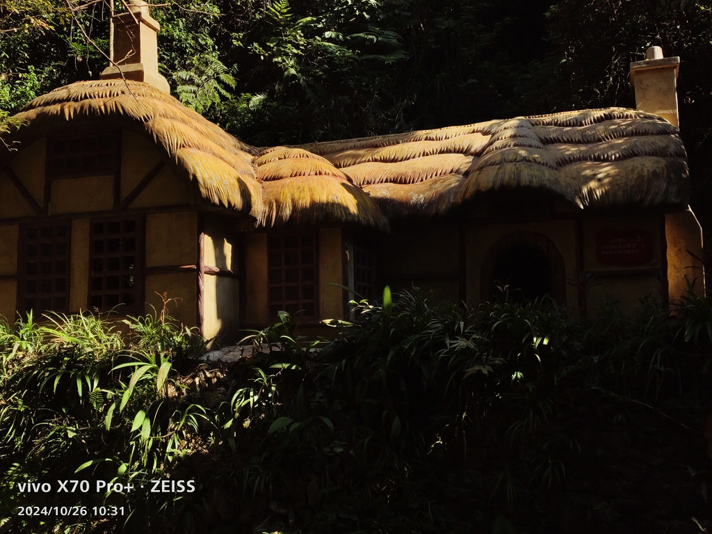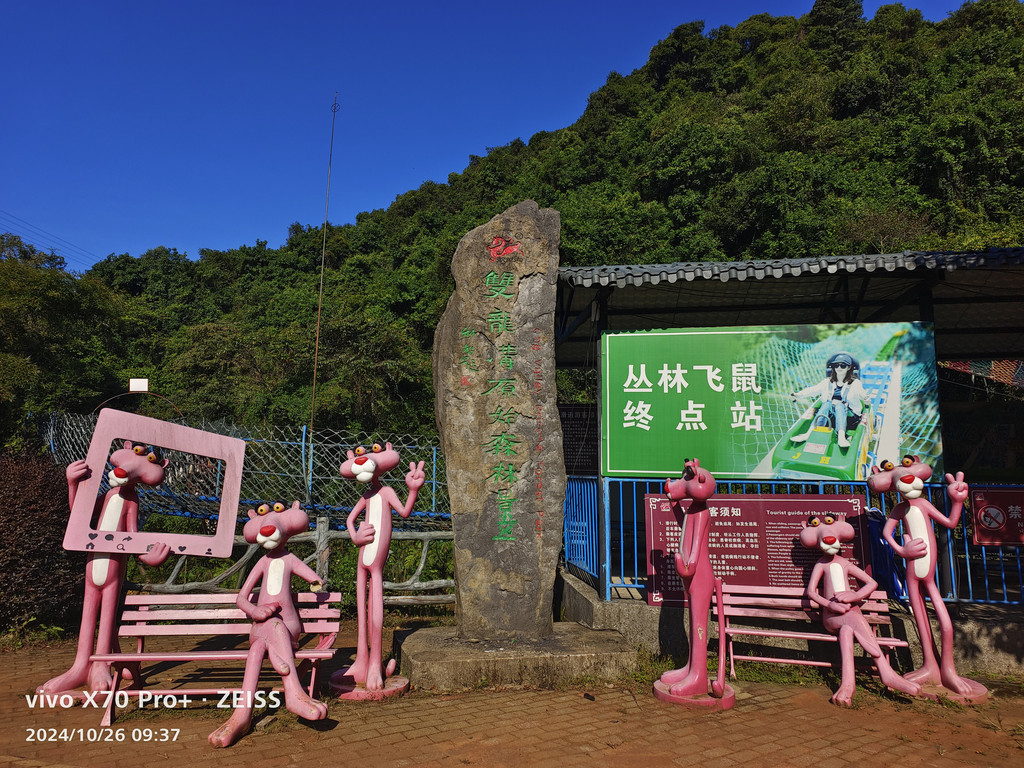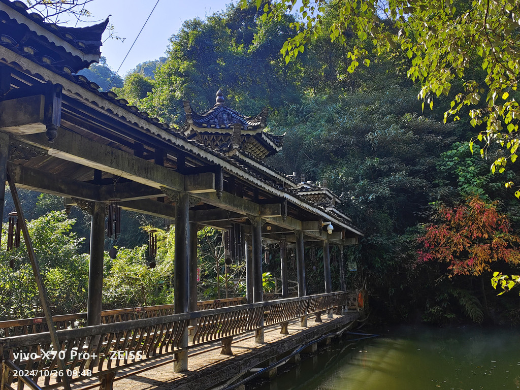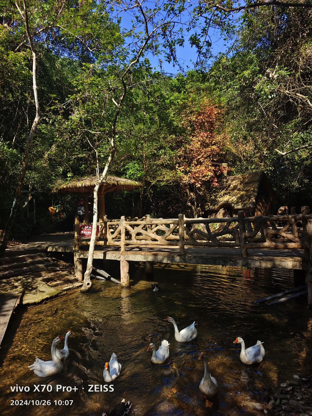景区最美的一段应该是刚刚进入景区的小溪栈道,清澈的溪水,低垂的黄叶,虽然有人工做旧的痕迹,但是效果颇佳,再加之水面上缭绕的喷雾,若如仙境一般。真正到了山上高空的项目,不仅要收费,大多是需要胆量才可参与,风景也大大逊色。