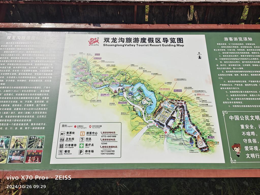 2024年10月26日早晨7点在酒店吃过早餐,退房,8点30分在酒店门口乘28路公交前往双龙沟景区,车费每人4元,9点5分到景区。景区门票80元,70岁以上老人享受半价优惠,包括观光车车费。