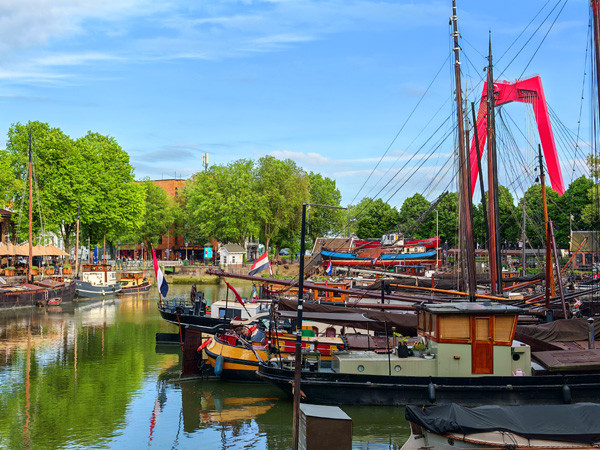 离开方块屋,漫步来到老港口。这里充满了历史的韵味,岸边停泊着各式各样的船只,远处的红桥横跨两岸,与周围的建筑相互映衬,构成了一幅美丽的画卷。沿着河边前行,看到了红色的天鹅桥,也就是伊拉斯谟桥。