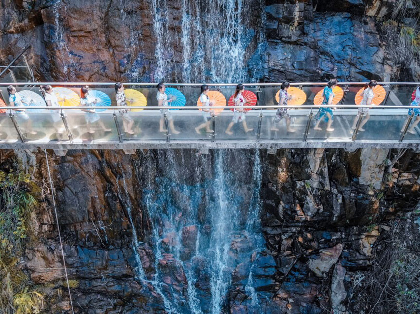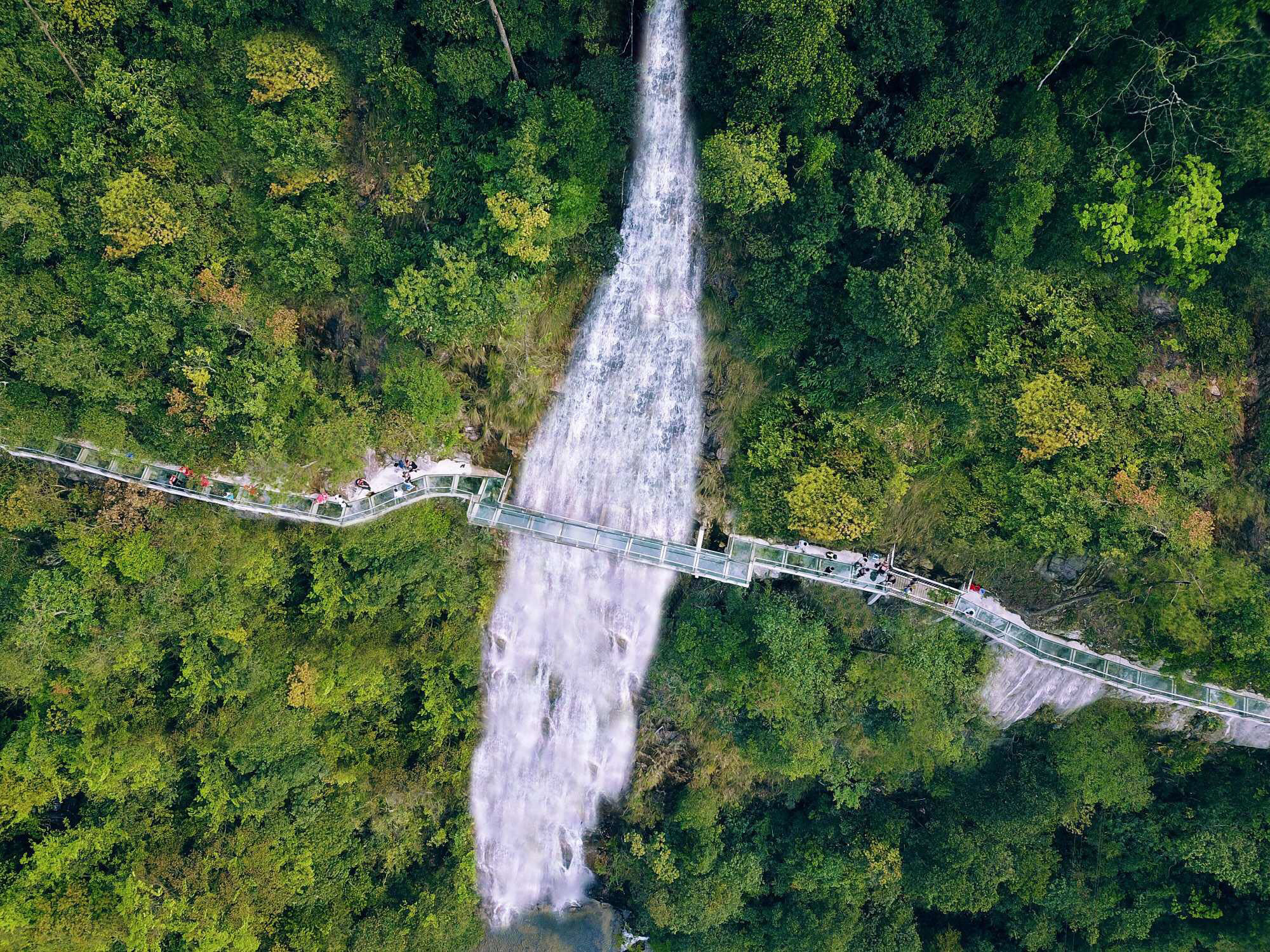 买好票排队验票后,可乘景区的专车前往。进入茂密的景区山林地带,放眼透过车窗,不时见到从山林中无意泻露下来的小小瀑布,宛如一下子把人带到了玻璃栈道。