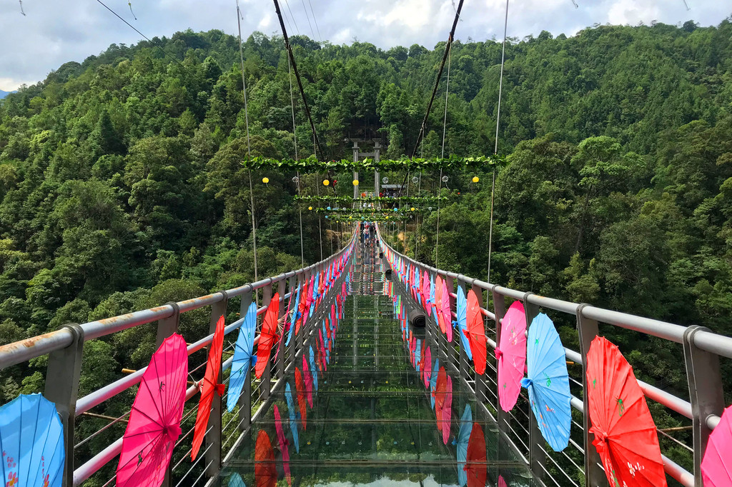 一条栈道488米,垂直高度300米的玻璃栈道蜿蜒而来,宛如林间青龙一样呈现在你眼前。上坡的游道,尽管有点陡峭,却不由地让人加快了前进的步伐,恨不得快点步入玻璃桥的腹地。