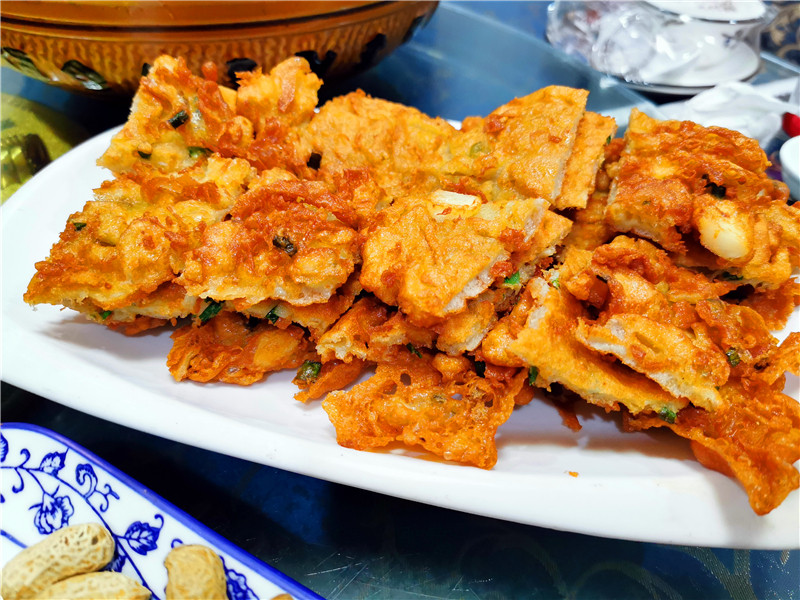 另一家麦塔锅大排档也不错,除了特色的海鲜外,有瑞安鹿木乡的麦贴锅可以点。麦贴锅是当地的一种称呼,有点像葱油饼。可以包糖,涂蜂蜜,也可以包菜,香肠,肉等。个人觉得咸味更好吃,而且一份量也很大。