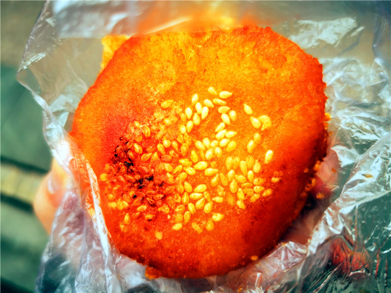 有一家做海鲜干货的店,老板娘早上会做一些糯米团子出售。团子的两面炸成金黄,里面放入不同馅料。因为糯米的所以摇起来比较软,但比较香。