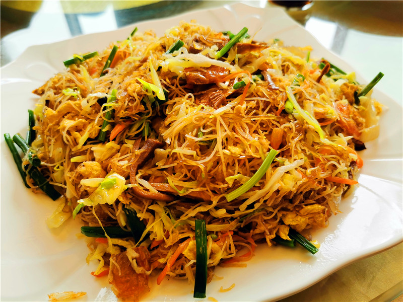 然后是当地人常吃的炒酸粉,他家的粉是地瓜粉和米份相混合,里面有虾干,笋干提鲜。炒的时候用黄酒和料酒,不放水。这样装盘后口感层次更加丰富。真的是越吃越想吃。