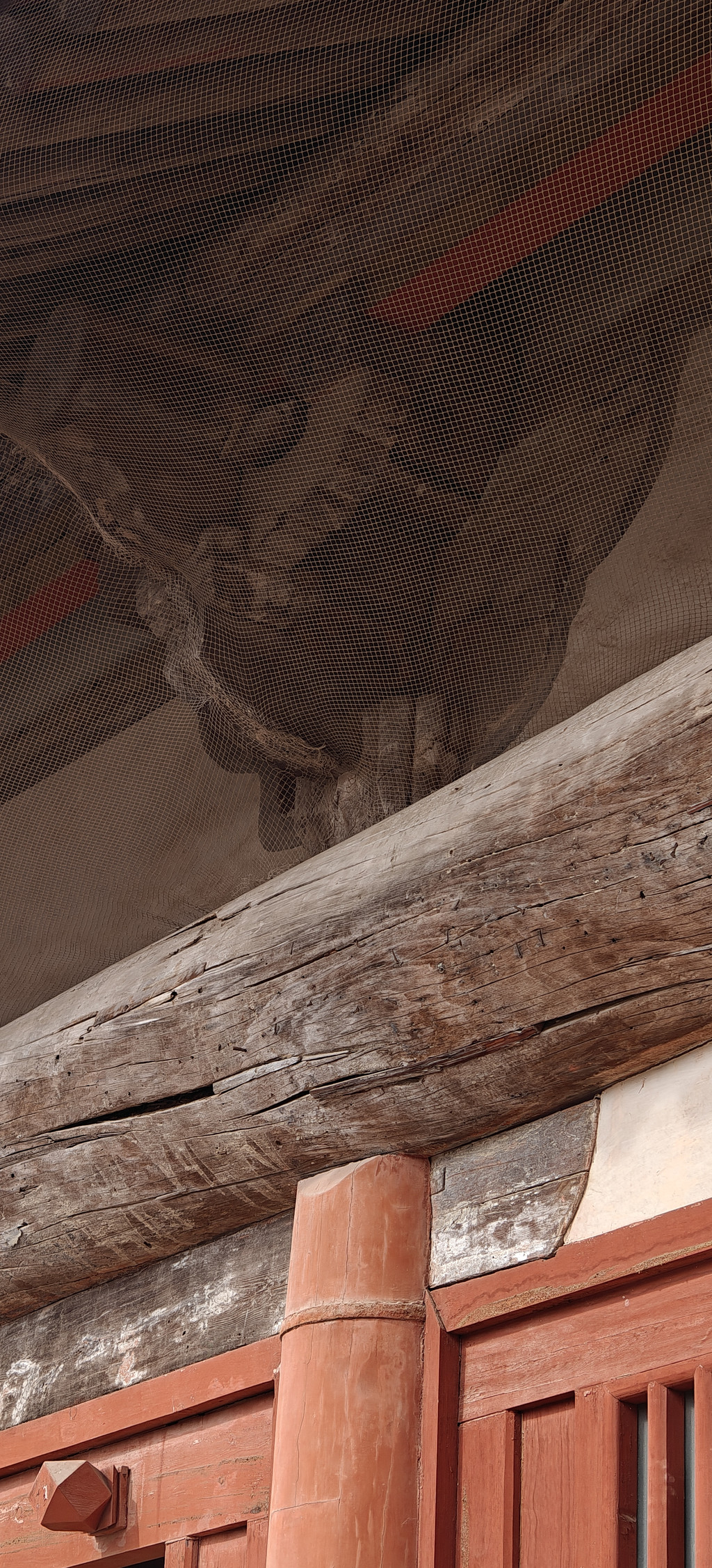 它位于离永乐宫不远的龙泉村里的小土丘上,原本就是村里为祈雨而建的龙王庙。它的正对面是一个戏台,面阔三间,进深也是三间,从空中看下来,一个方方正正的盒子。比起五台山那两个恢宏唐建,真看不出唐代的味道。