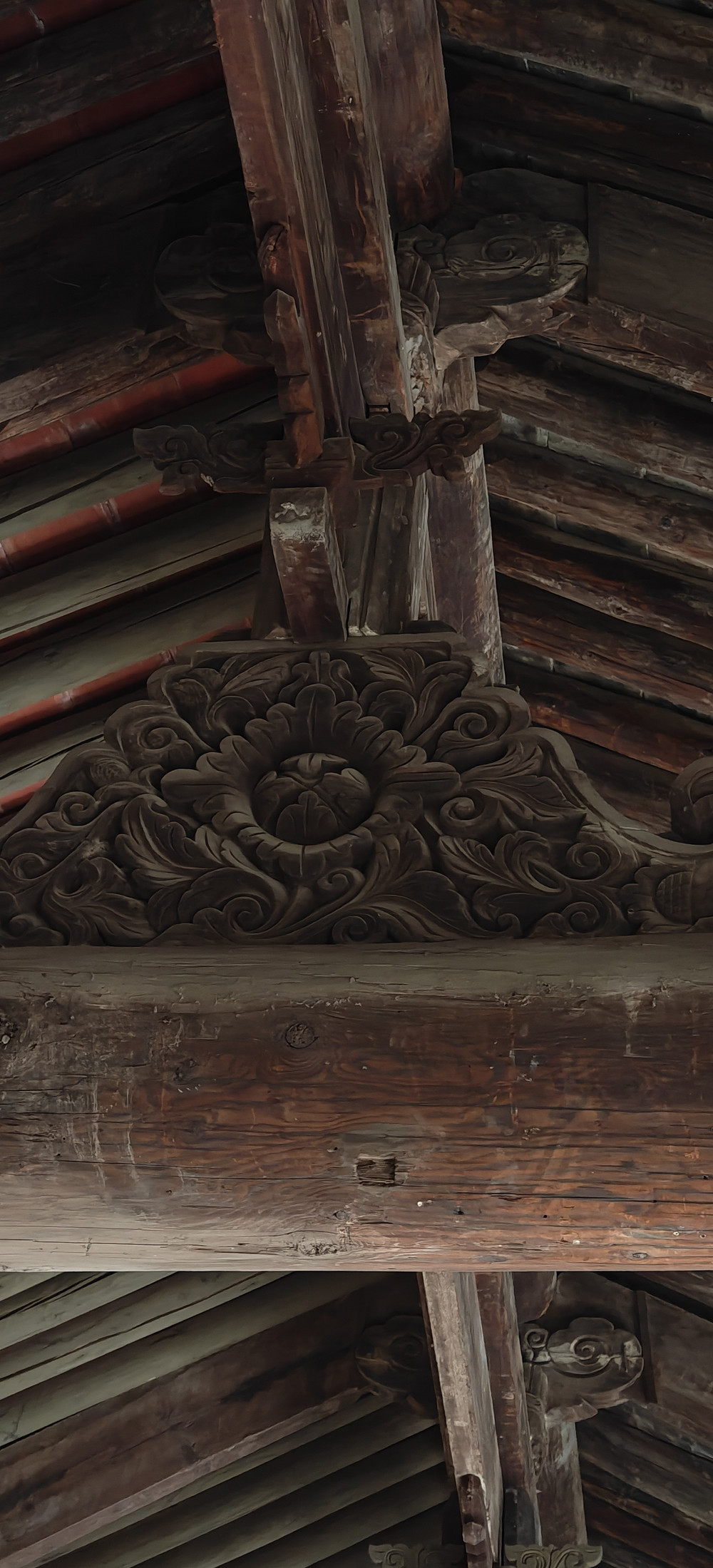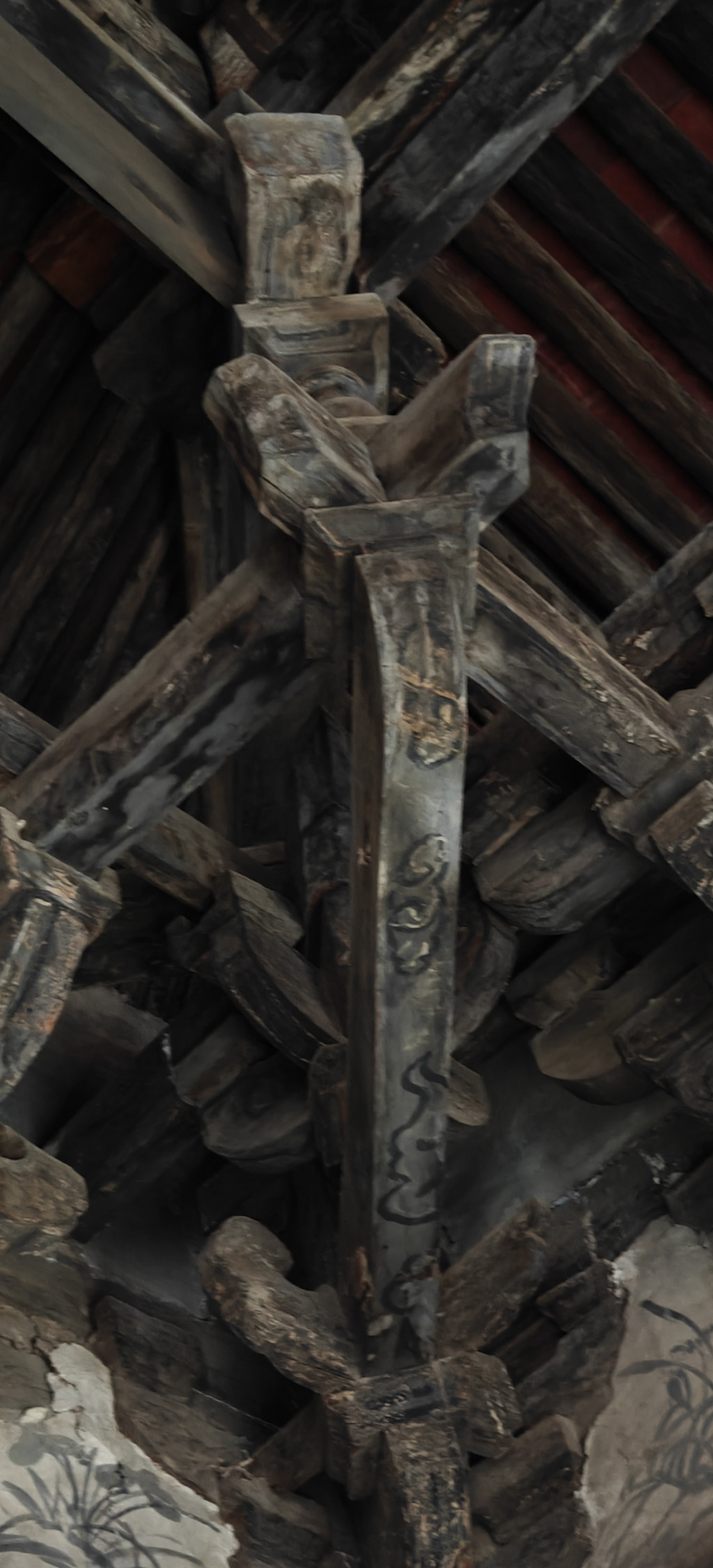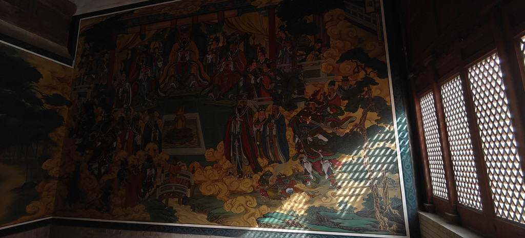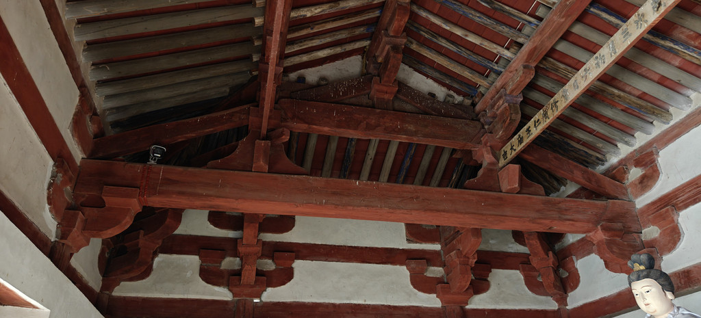 看到硕大的梁架,我大概能猜出来是元代的古建,因为只有元代才会有如此简单直接把原木放上去的做法,有些横i梁还是不规则的。主殿内的壁画,也是清代。没有围栏,你可以很近地观赏。我只能感叹,山西的文物实在太丰富了,这种元代的建筑、清代的壁画,如果来到广东,那不要供起来当国宝,而这里,是随便搁在那里,好象摆地摊般,随你挑。