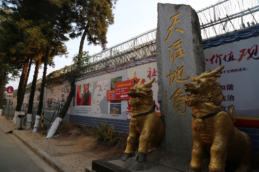 姐告口岸是国家级边贸口岸,依边境而建,中间的主国门上书“中华人民共和国瑞丽口岸”,庄严而神圣,左为人员通道,右为货物通道,穿过国门就是缅甸的木姐市。口岸的国境线长4186米,有九坐界碑,用铁栅栏分隔。8点多钟抵达口岸时,太阳刚刚升起,许多游人在国门前逆光留影纪念。