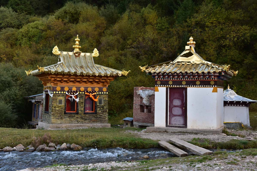寺中的五世格尔登活佛肉身殿是郎木寺景点中的精华,供奉着圆寂后几百年都不腐坏的活佛肉身,十分神奇。但去时太晚,大殿的门都关了,很遗憾。寺有有白龙江的源头,试着走了一下,源头峡谷深邃,道路艰难,最深处有马道,人只能踩着水中的石头前行,景色倒是不错,行不多远便回来了,想着明天早上再来。可惜,很多事情就是这样错过的,第二天下雨,气温骤降,完全不能出行,甘肃的达仓郎木赛赤寺也只能匆匆一瞥。