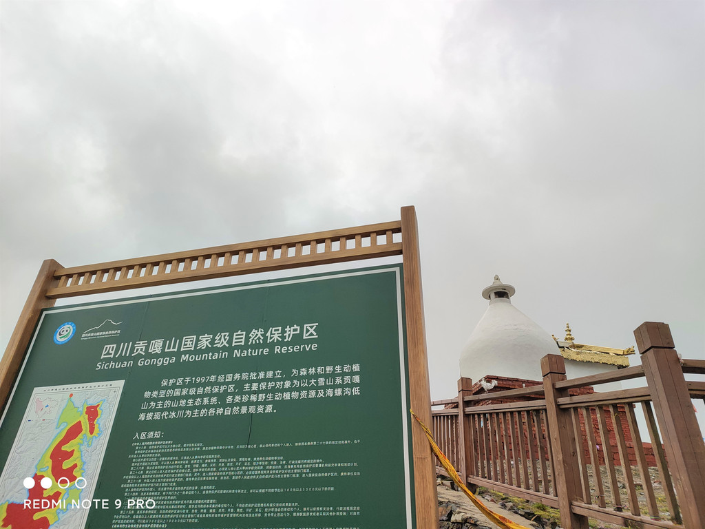 在山峰垭口处,耸立着一座白塔,白塔四周经幡飞舞,远处还能眺望到“蜀山之颠”——海拔7000余米的贡噶山。