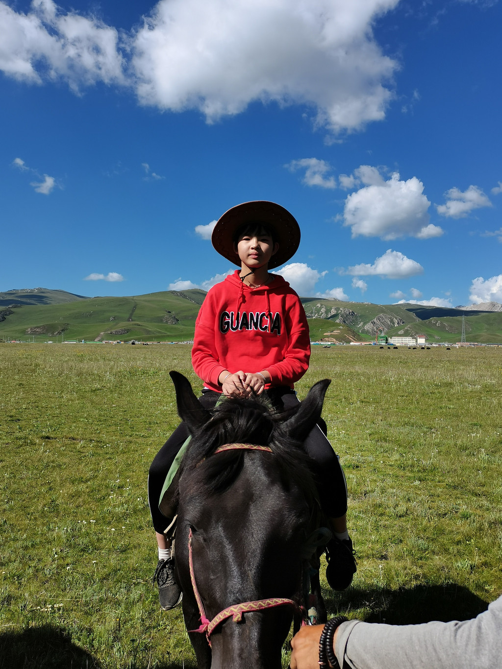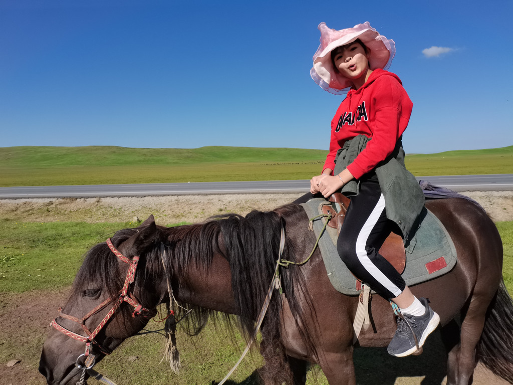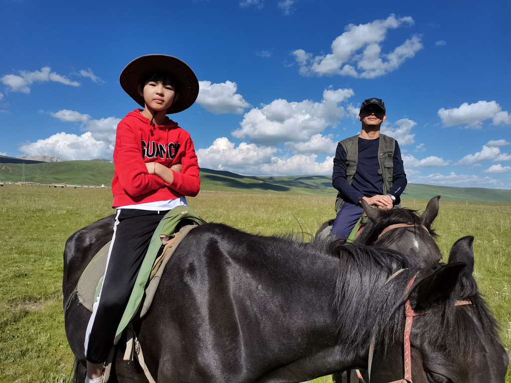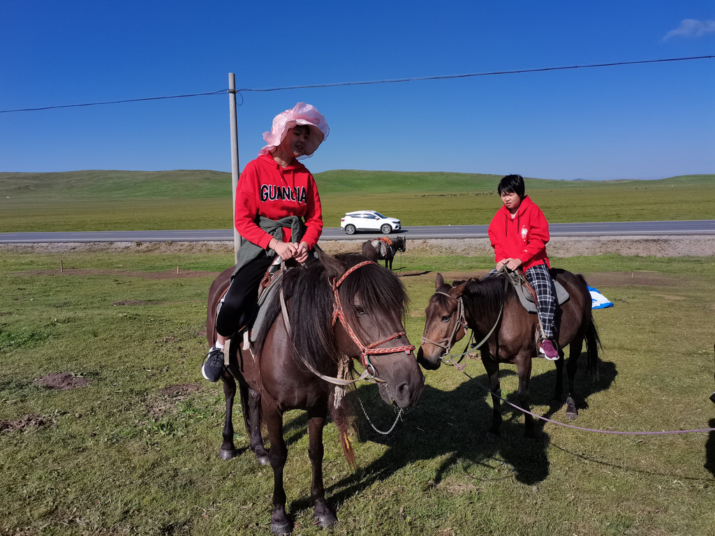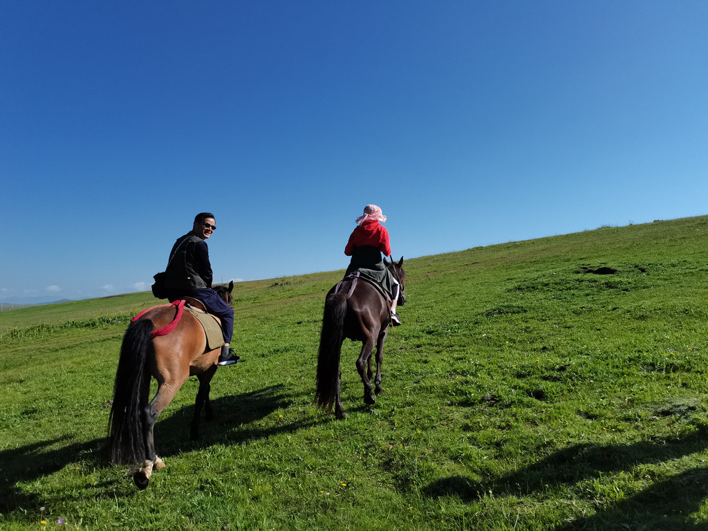 正好有马场老板推销骑马,虽然骑马场地离尕海边还有一公里左右的路程,但是想着骑马的费用和景点门票也差不多,主要还能让孩子们再体验一下大草原,于是我们选择了把门票钱花在骑马上。