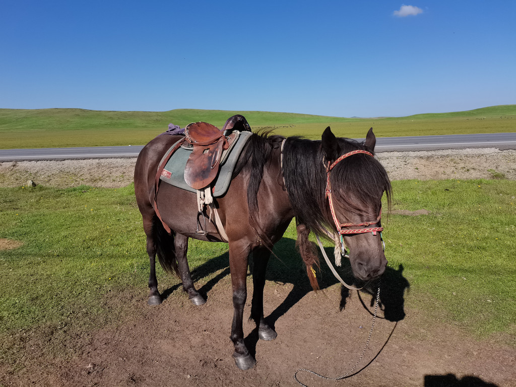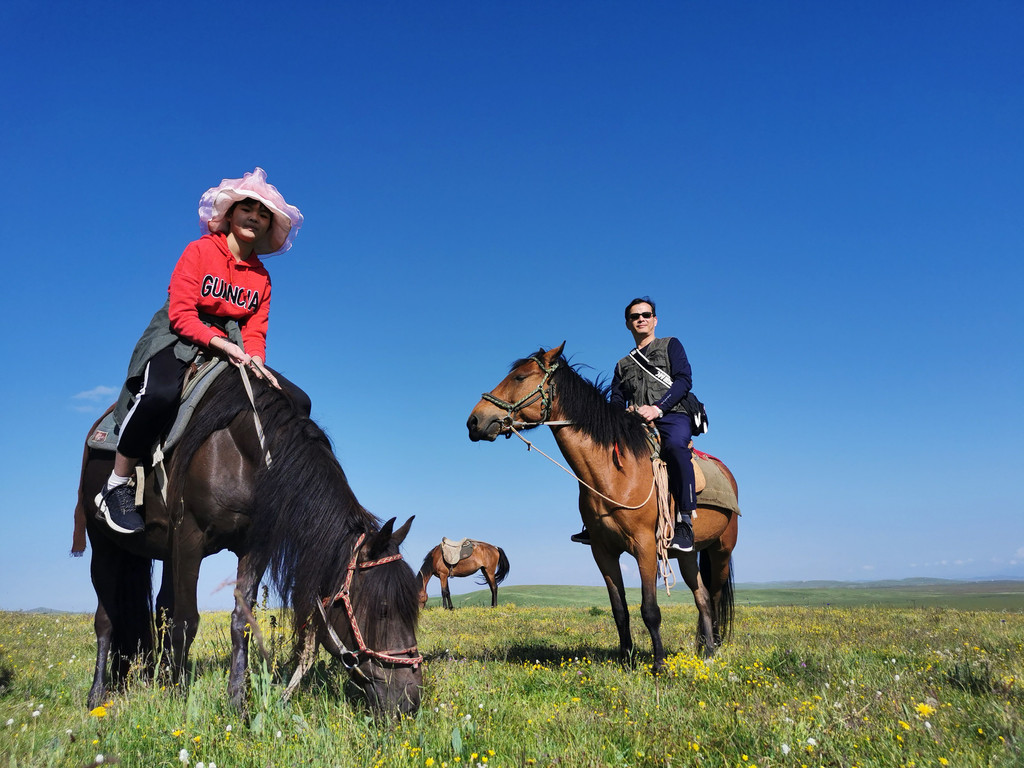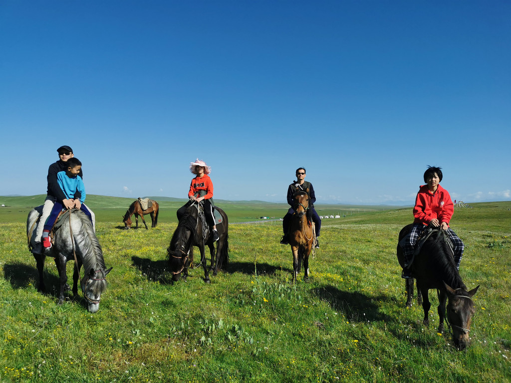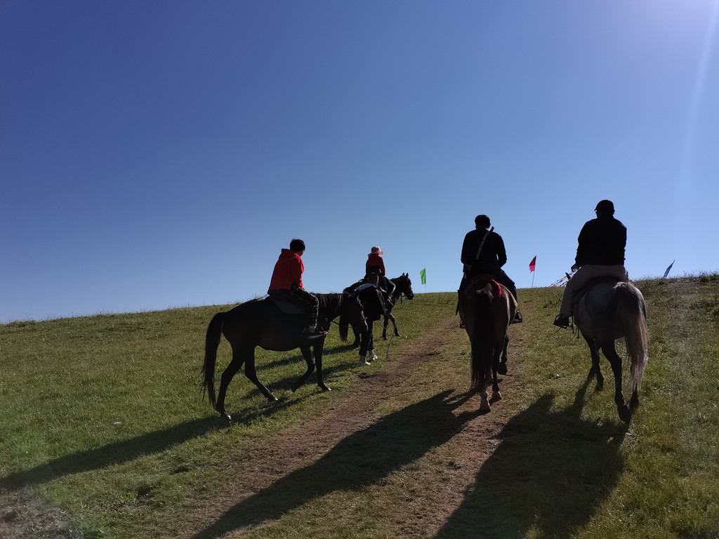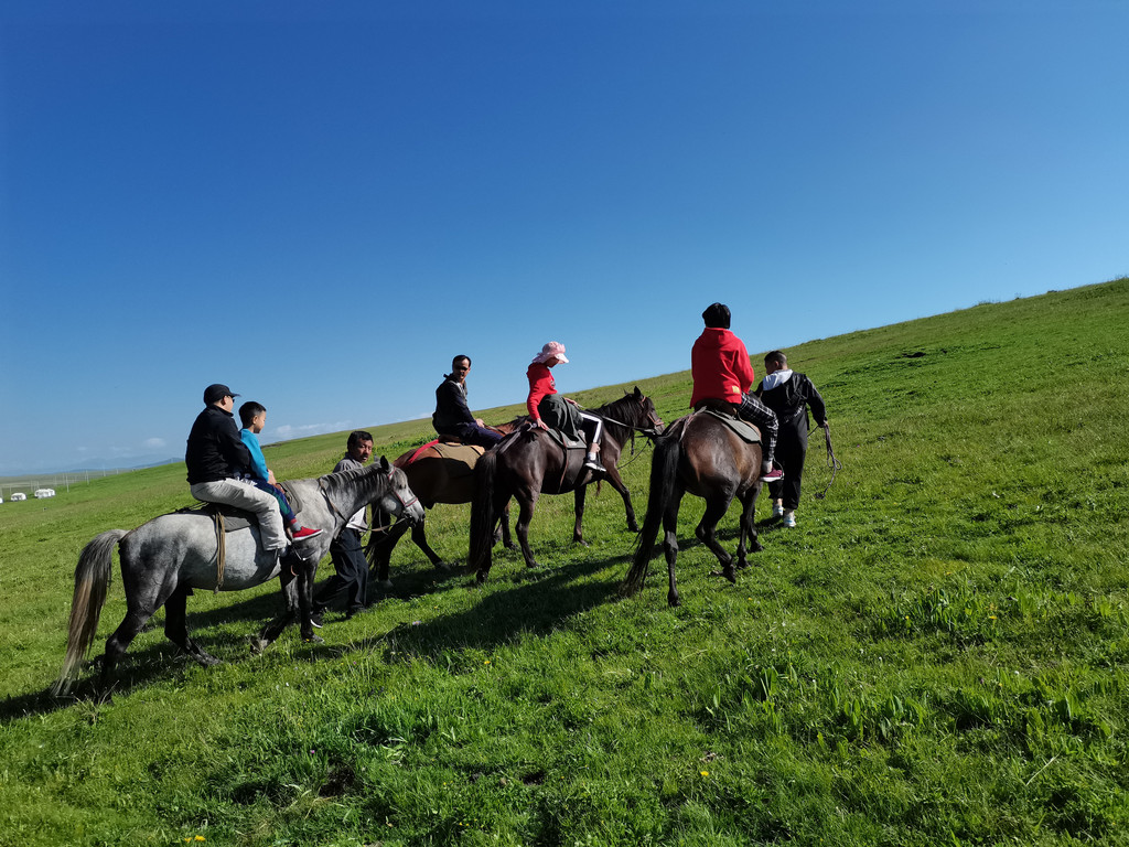 正好有马场老板推销骑马,虽然骑马场地离尕海边还有一公里左右的路程,但是想着骑马的费用和景点门票也差不多,主要还能让孩子们再体验一下大草原,于是我们选择了把门票钱花在骑马上。