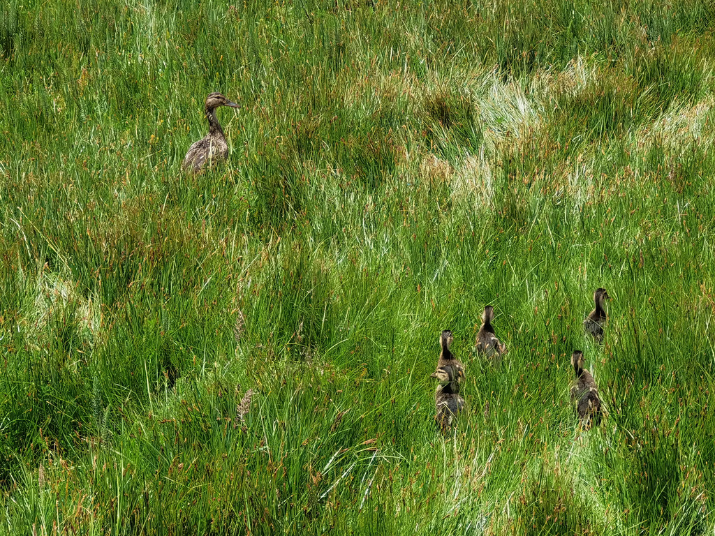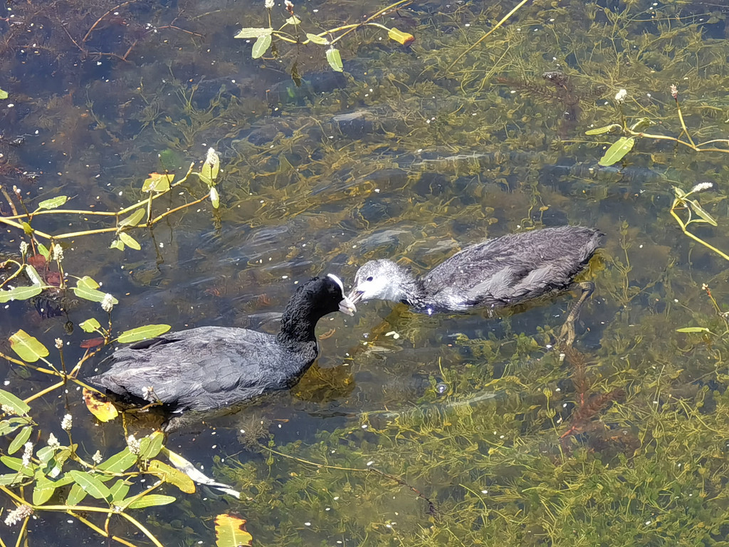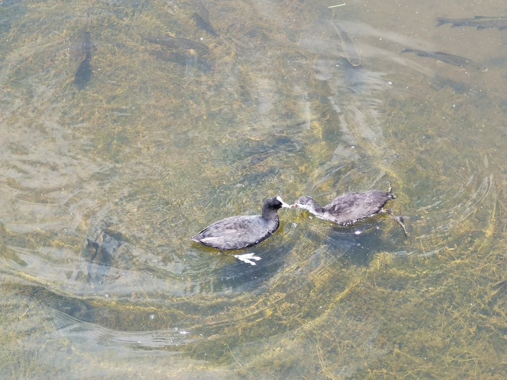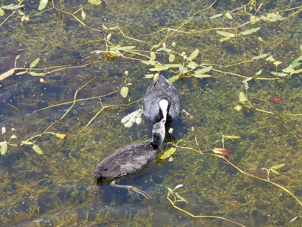 当时我们就沿着木栈道走着,能听到下面这种水鸟(因为不知道它的品类,姑且就叫它“水鸟”吧),在草丛里叫声凄厉,我们顺着叫声望去,看到一只大一点的水鸟在奋力的用嘴巴扯着从水底拉出来的草根,试图咬断,不远处发出叫声的是一只体型稍小一点的水鸟,女儿试着向它投去饼干碎片,只见那个大水鸟精准的啄了去,然后游到小水鸟边上,给小水鸟喂食,看到这里,我们似乎都明白了,原来小水鸟是太饿了才发出叫声的,于是女儿就撒了更多的碎饼干过去,小水鸟看到水面上漂浮的食物,一个劲的吃, 而更感人的画面是,大水鸟看到它的宝宝可以吃水面上的食物它并不一起抢,而是自顾自的又去扯水底的草根了,原来她只想把好的留给自己的宝宝,自己去啃食一些草根,看到这里真的让我差点热泪盈眶!原来伟大的母爱哪怕是鸟儿们的世界也是感天动地的!