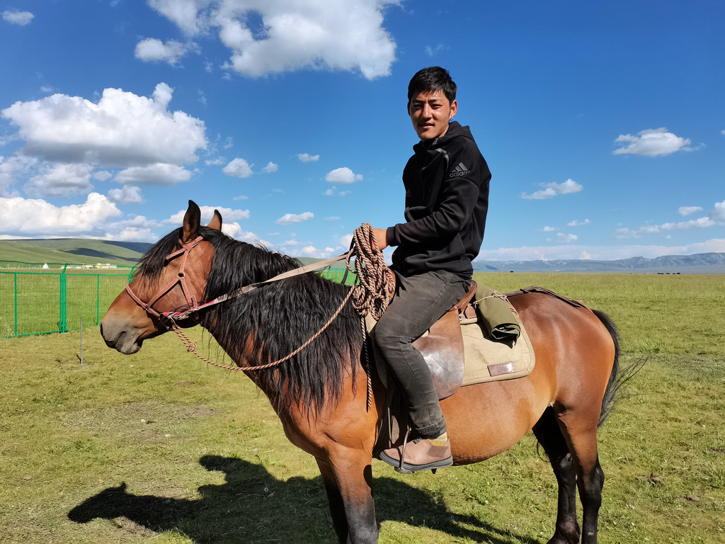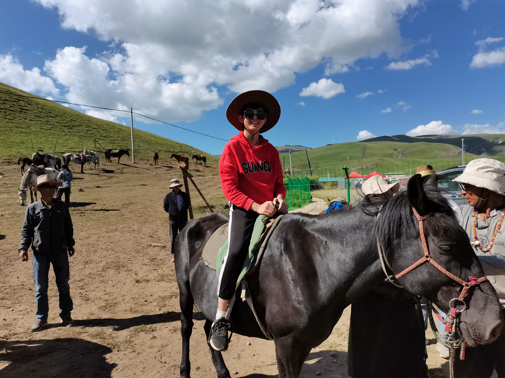 这次我也体验了骑马,不过在尕海骑马都是有专人牵马的,本来给我牵马的是一个上了年纪的腿脚还不太方便,我甚是担忧,当时马走在草地上,不小心一脚踩在坑洞里,马一个前倾,我吓的真怕把我翻下去啊!还好,没走多远,遇到一个回程的马队,给我牵马的人换成了一藏族小伙子,由此,我也放下了一半悬着的心,毕竟总感觉年轻人他有力量,也更有马技吧,如果万一这马来了疯劲啥的,年轻人多多少少还是可以保护一下我的吧~