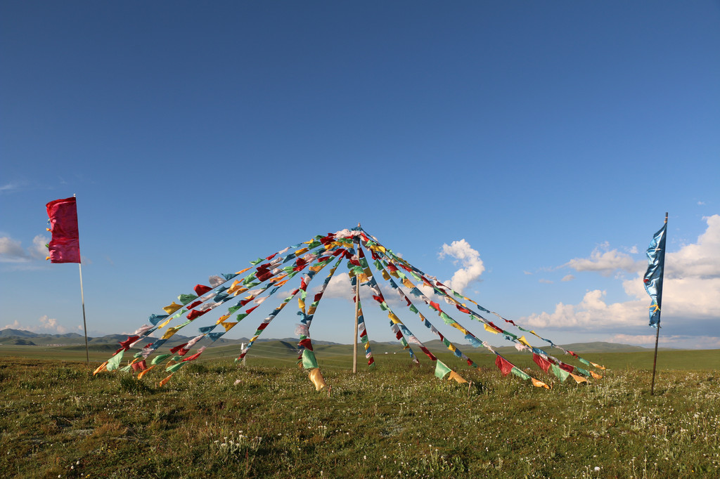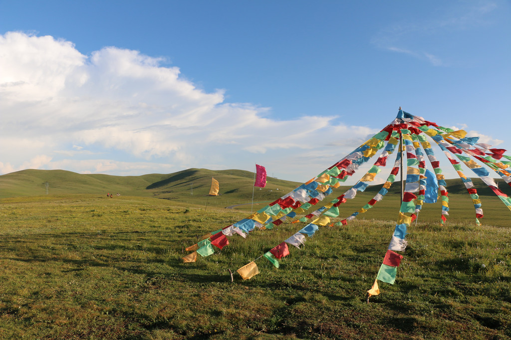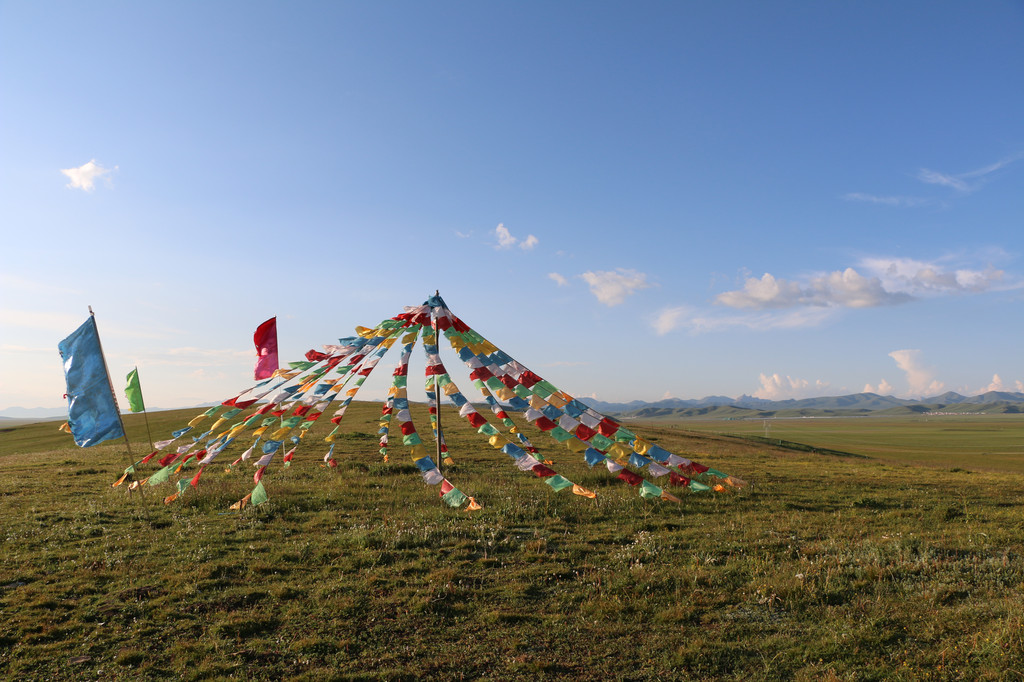 一种是印有佛陀教言和鸟兽图案的蓝白红绿黄五色方块布一块紧接一块地缝在长绳上,悬挂在两个山头之间,这种经幡常见于人烟稀少的高山上。