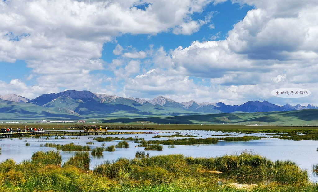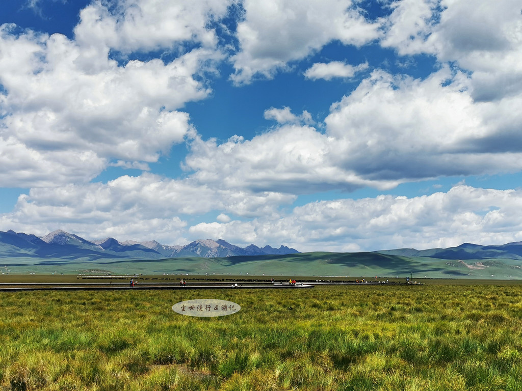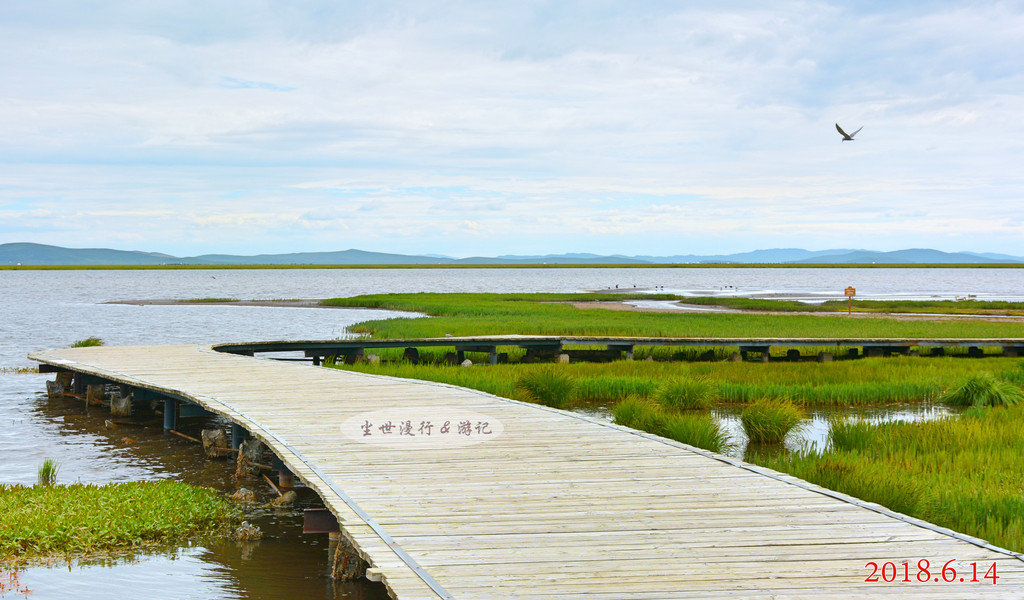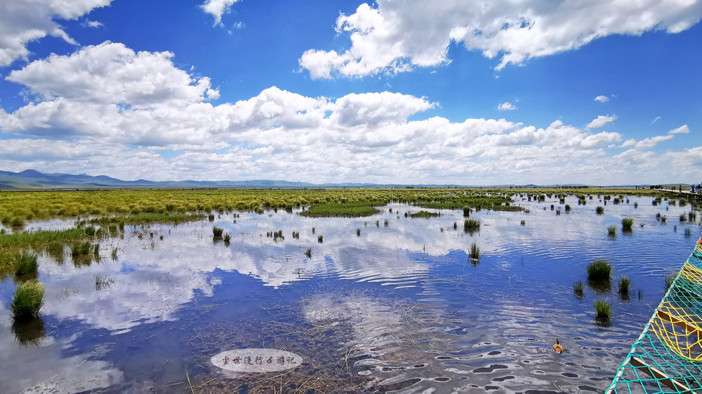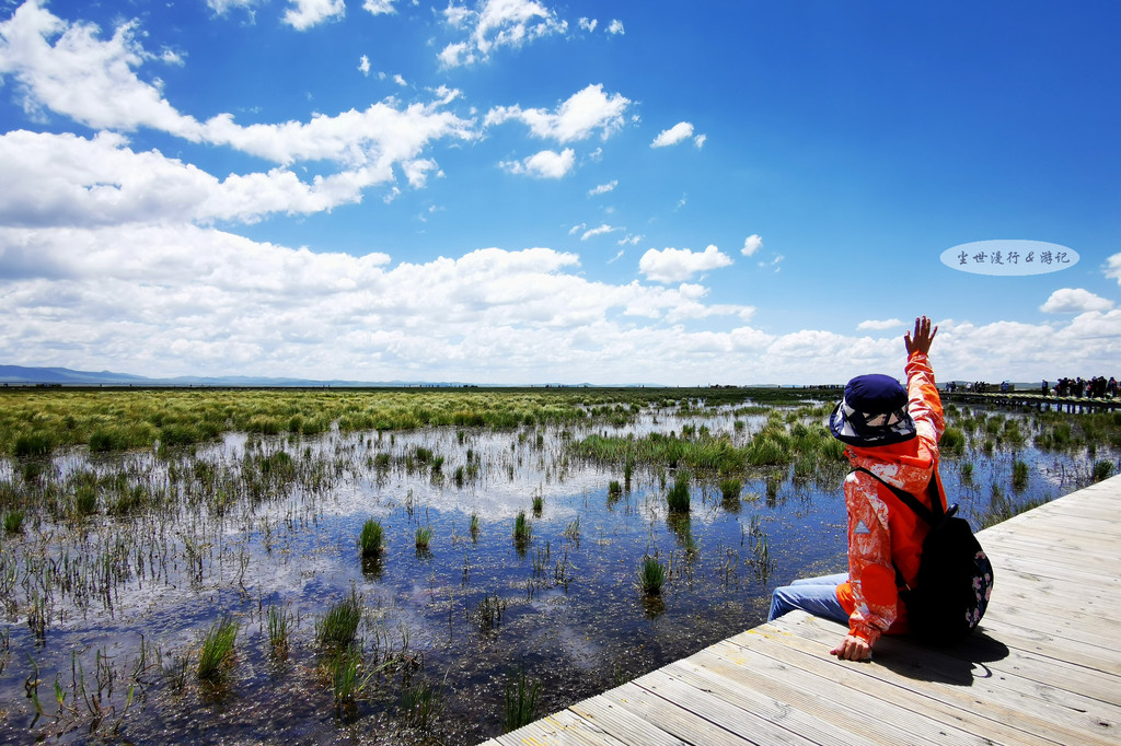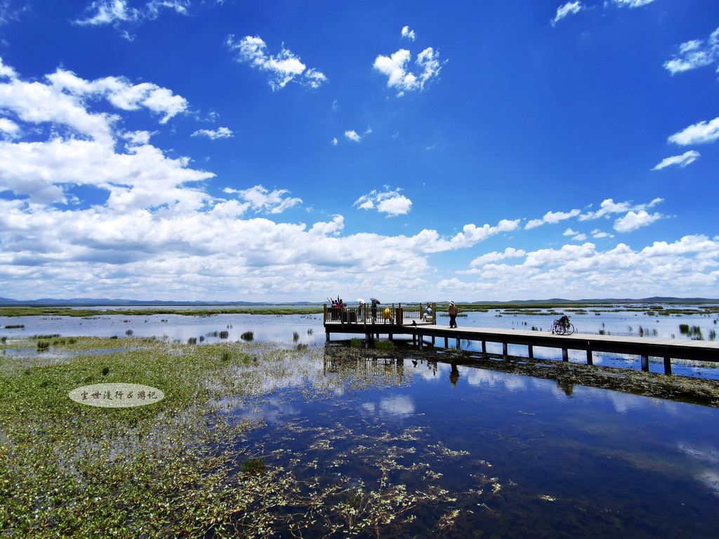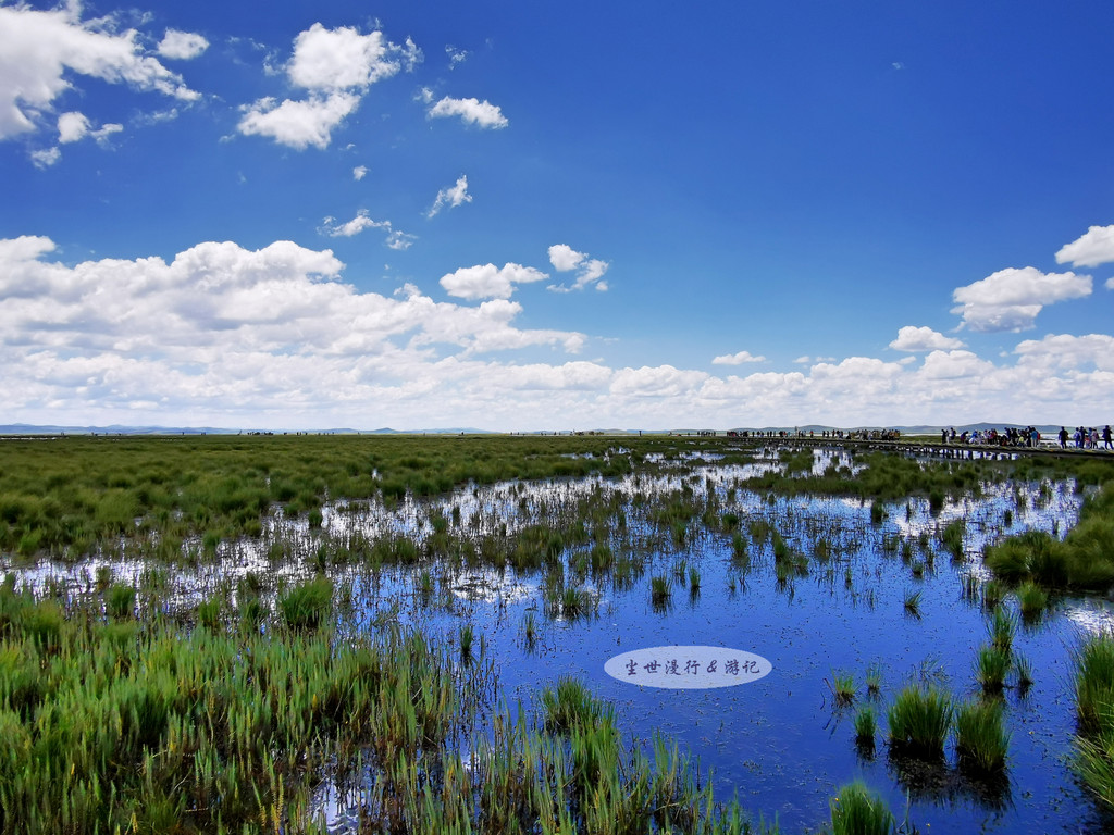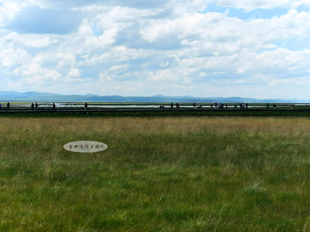 前方出现圆盘分叉栈道。从右侧沿栈道而行,这里的视野非常辽阔,水草丰茂,远山如黛,天空是如此的低,触目所及的是一望无际的草原湿地。