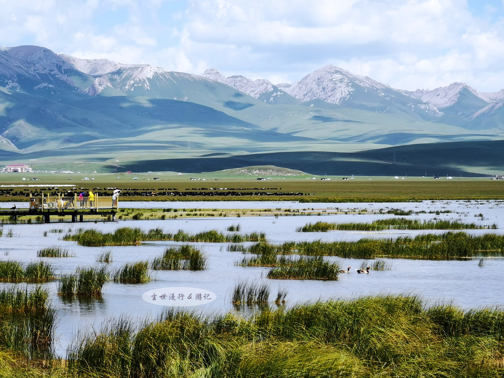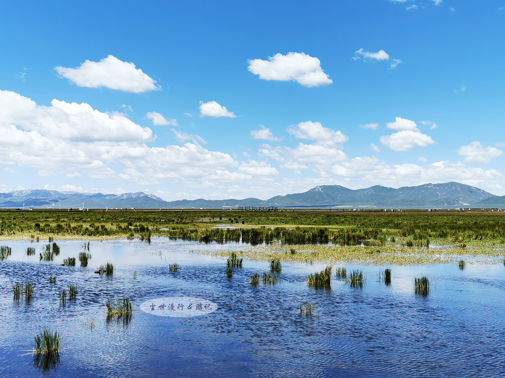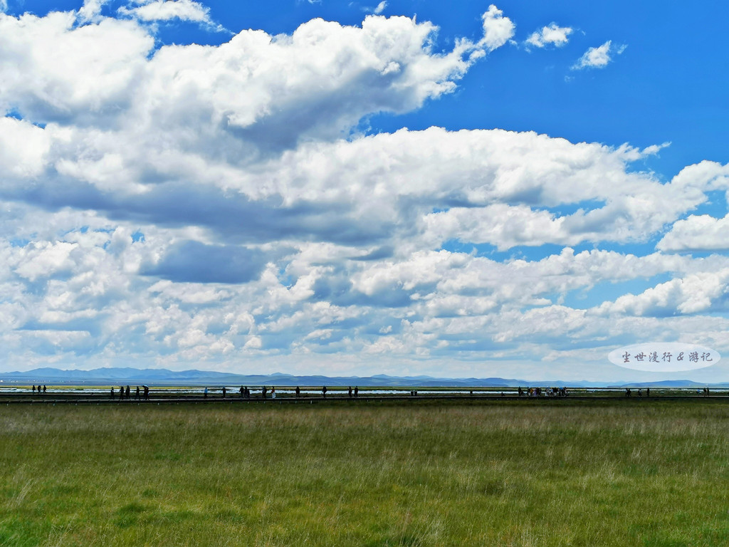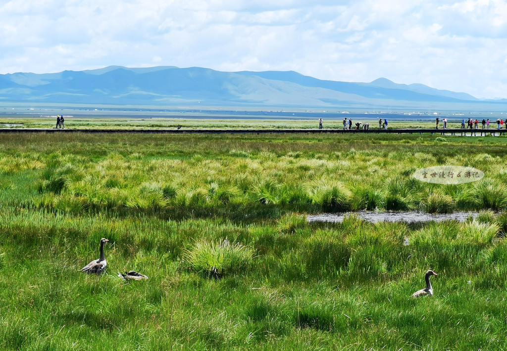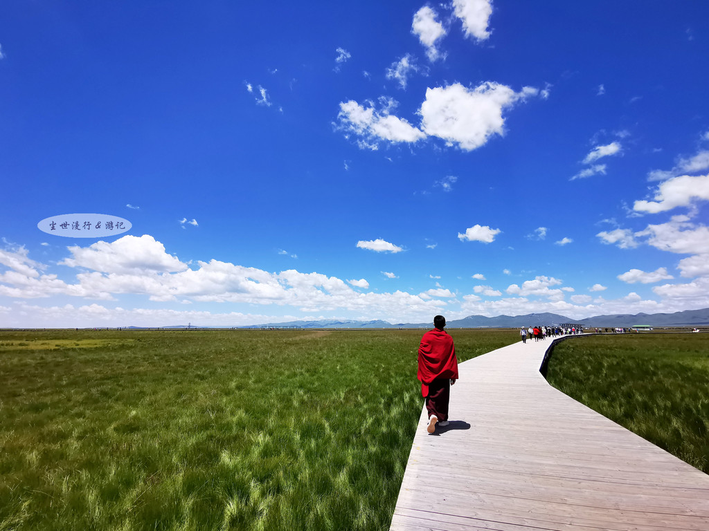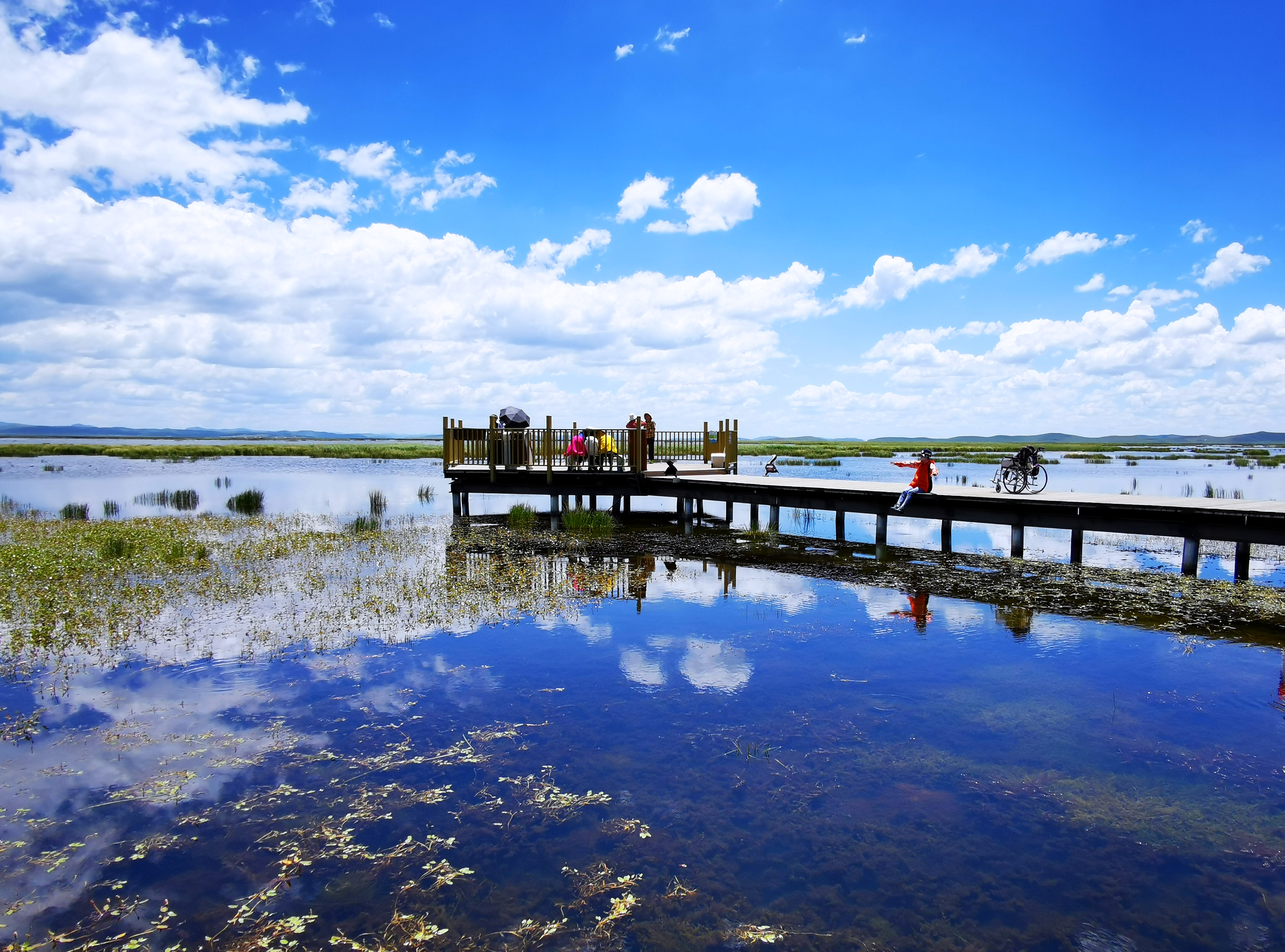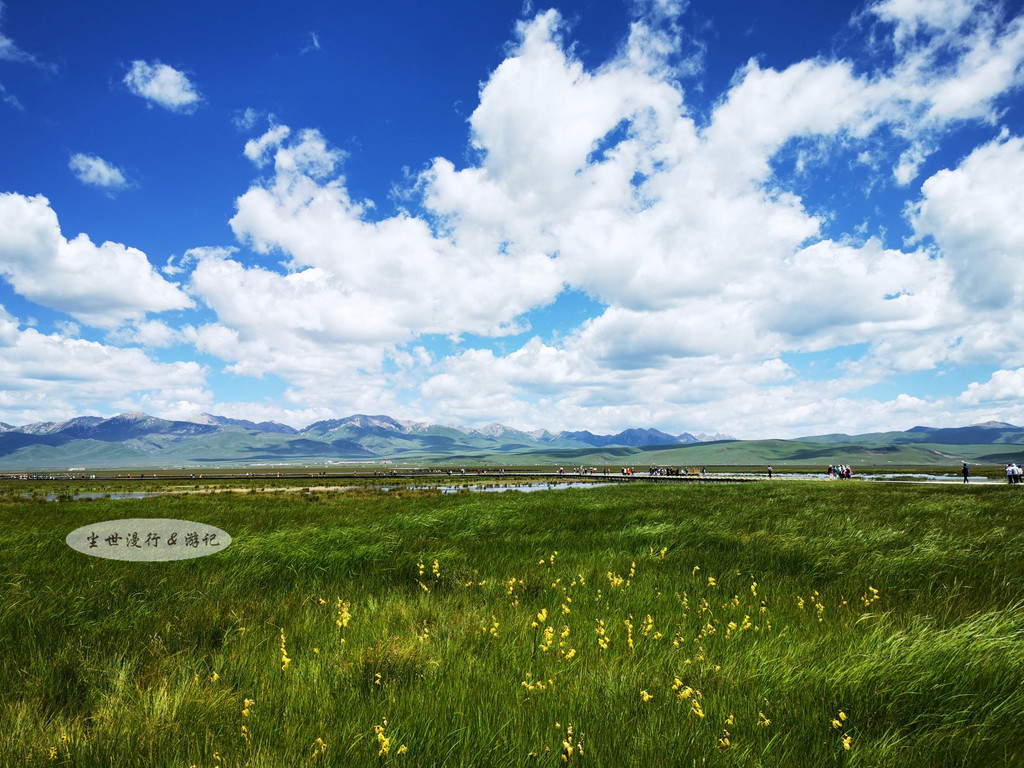 前方出现圆盘分叉栈道。从右侧沿栈道而行,这里的视野非常辽阔,水草丰茂,远山如黛,天空是如此的低,触目所及的是一望无际的草原湿地。