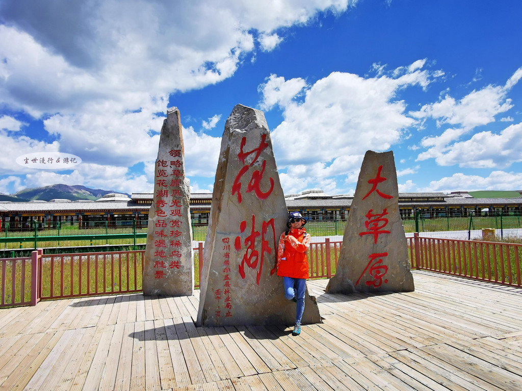 从下观光车至花湖有段长约1.5公里步行栈道,栈道两侧是广阔的草原——“蓝蓝的天上白云飘,白云下面马儿跑”,歌词里的场景出现在了眼前,只不过“马儿”变成了肥嘟嘟的白色藏羊与黑色牦牛。