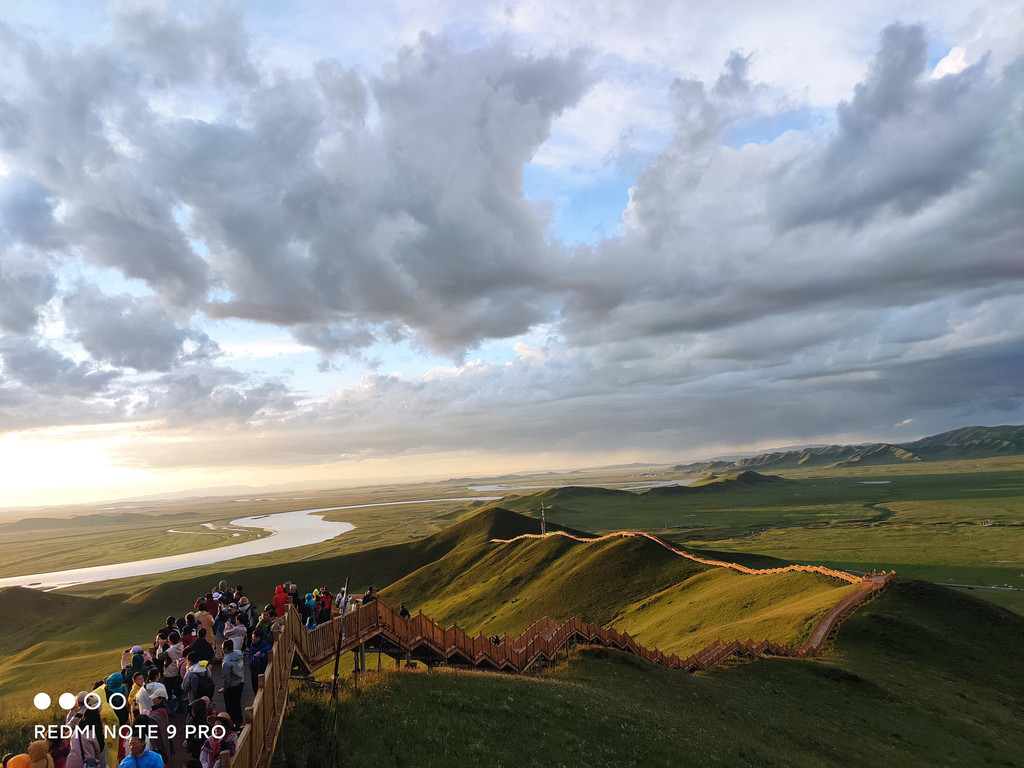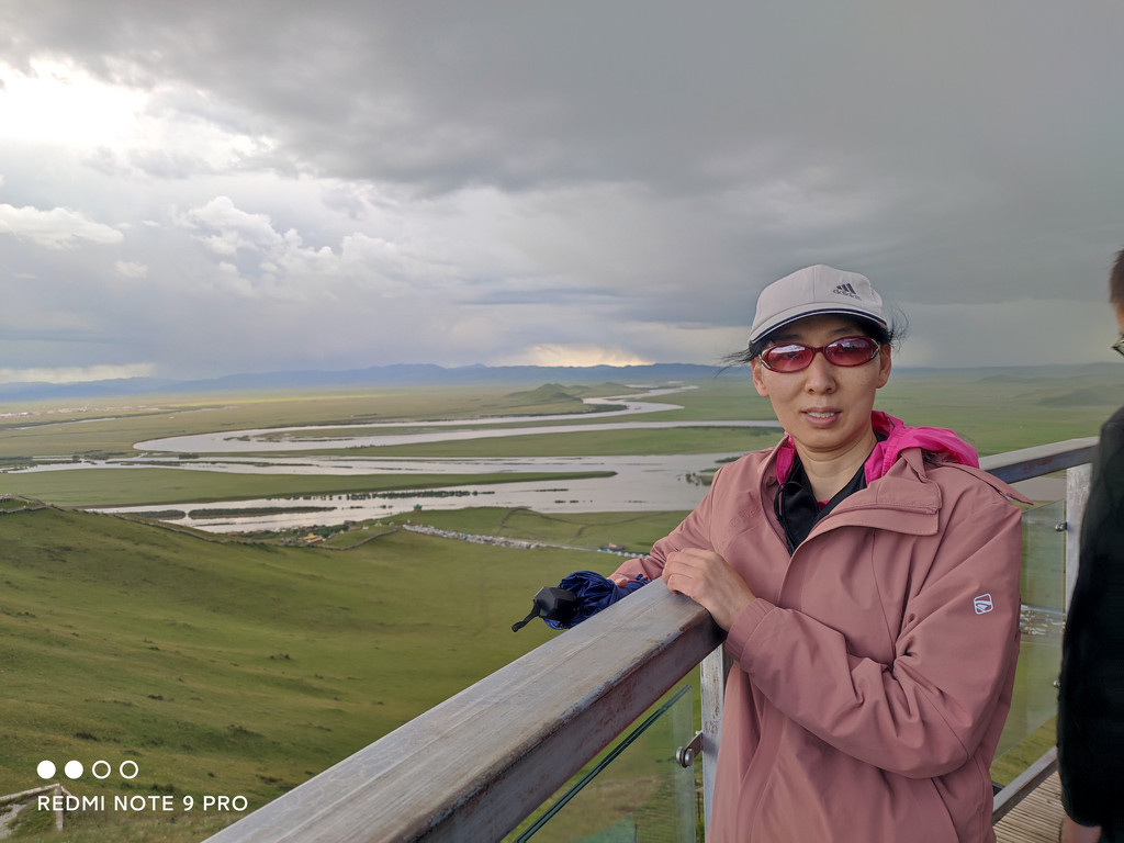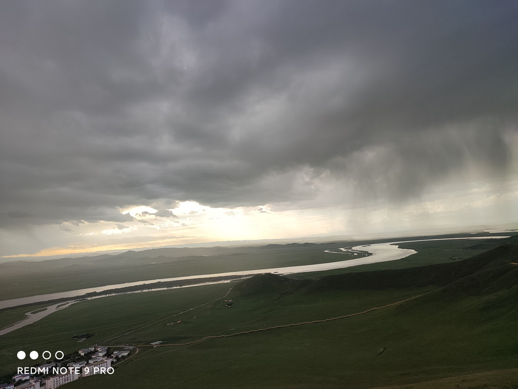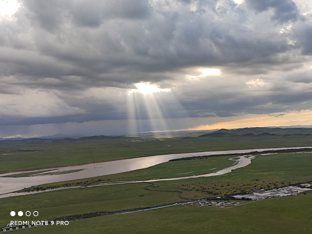 去九曲黄河第一湾主要看天气,如果是白云朵朵,或雨后初晴,那景观就比较好看。我们这次运气是非常好的。一开始是天气晴朗,到黄河边湿地公园近距离看了一会黄河和白河交汇的景致,然后就去沿栈道上观景台。刚准备往上走,突然下起了大雨,只能暂时躲避,过了半个小时,雨停了,太阳又出来了,霞光普照大地,云朵一片金黄,过一会又下雨了,远处可以看到云朵下像瀑布一样的云,非常奇特。等天快黑了,云彩逐渐发红,霞光景观出现了,非常漂亮。一次非常难得的经历。