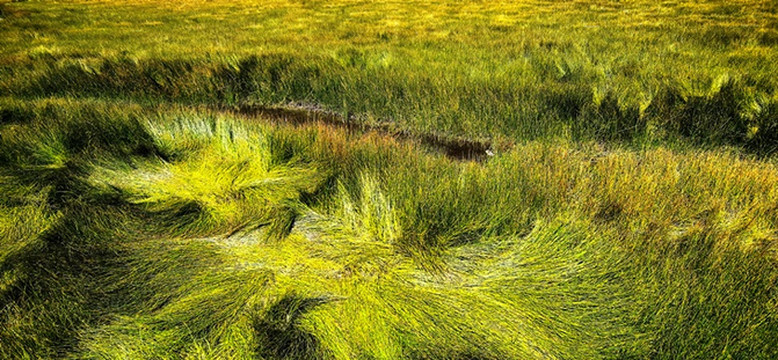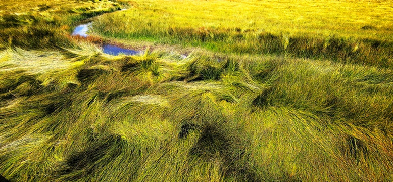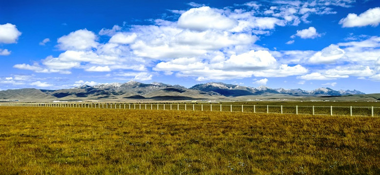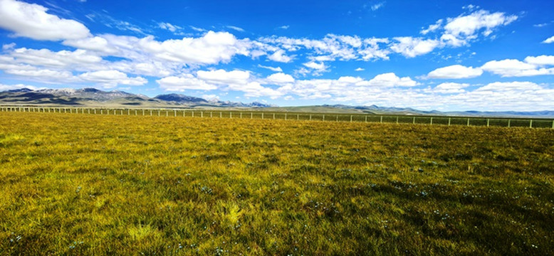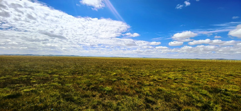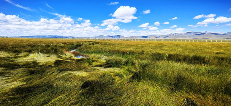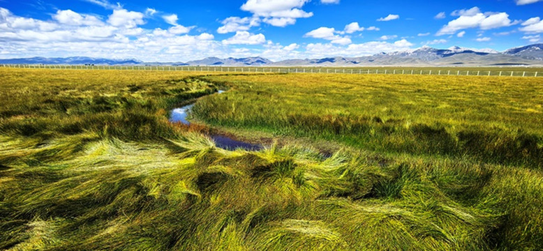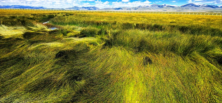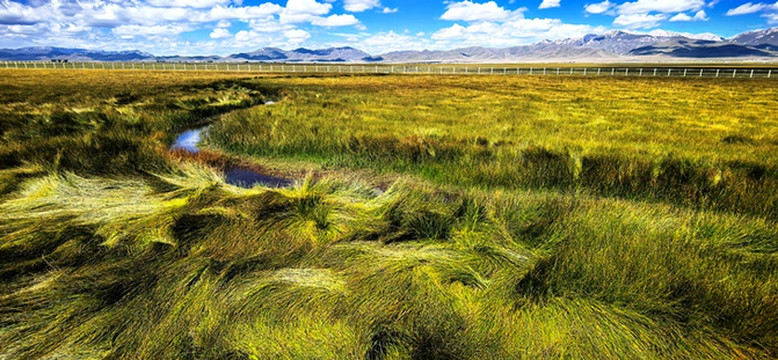 绿黄红相间倒伏的青草,映着蓝天白云静静的小溪,蓝天白云映衬下的远山,大自然绘制的油画。