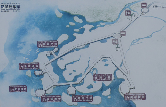 花湖建有环形栈道,全程约5.8km。沿途有休息点、服务店和卫生间。