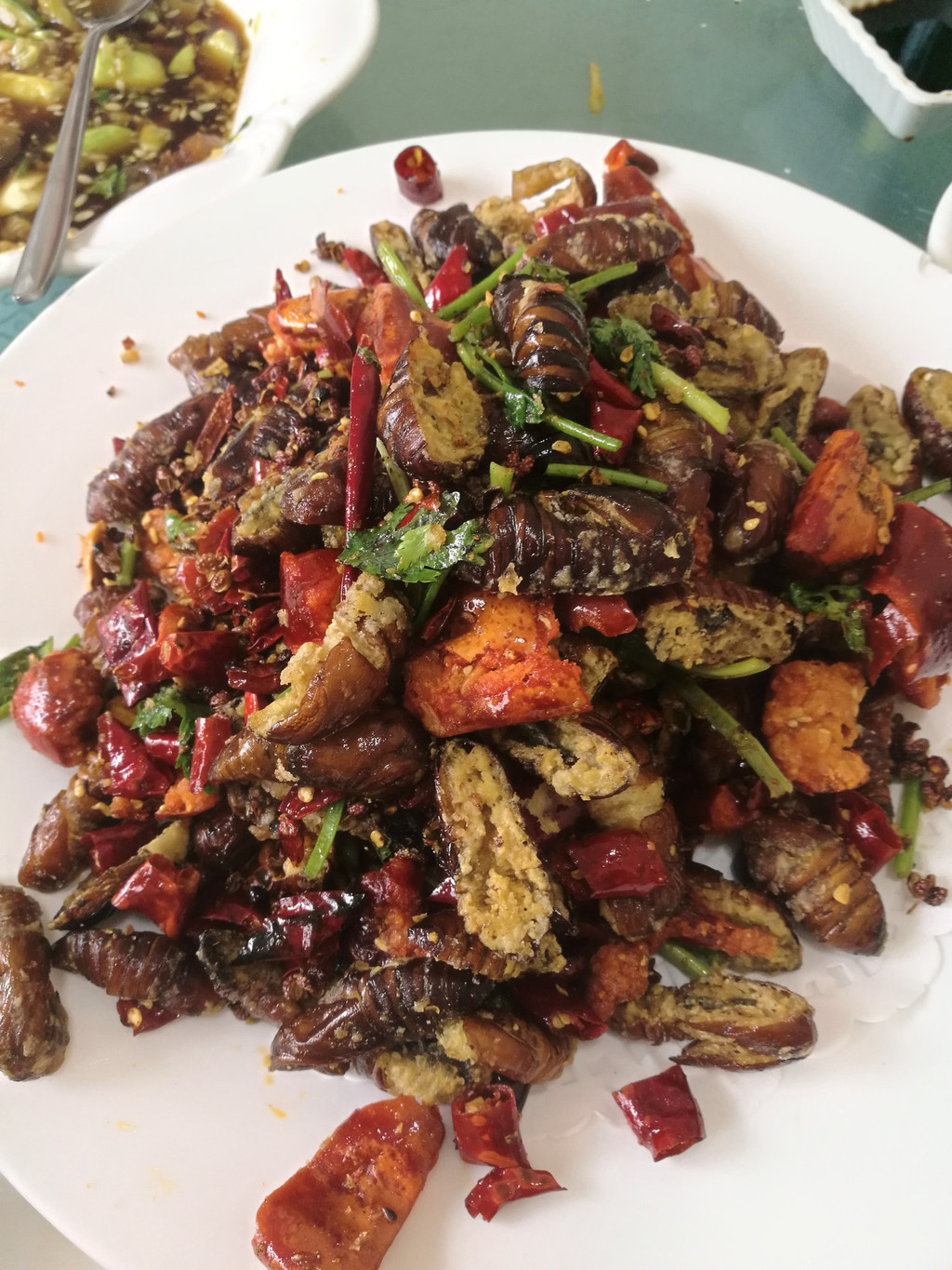 油炸后的茧蛹没有吃到原汁原味,还是姐用白菜炒的茧蛹有浓浓的满足感。