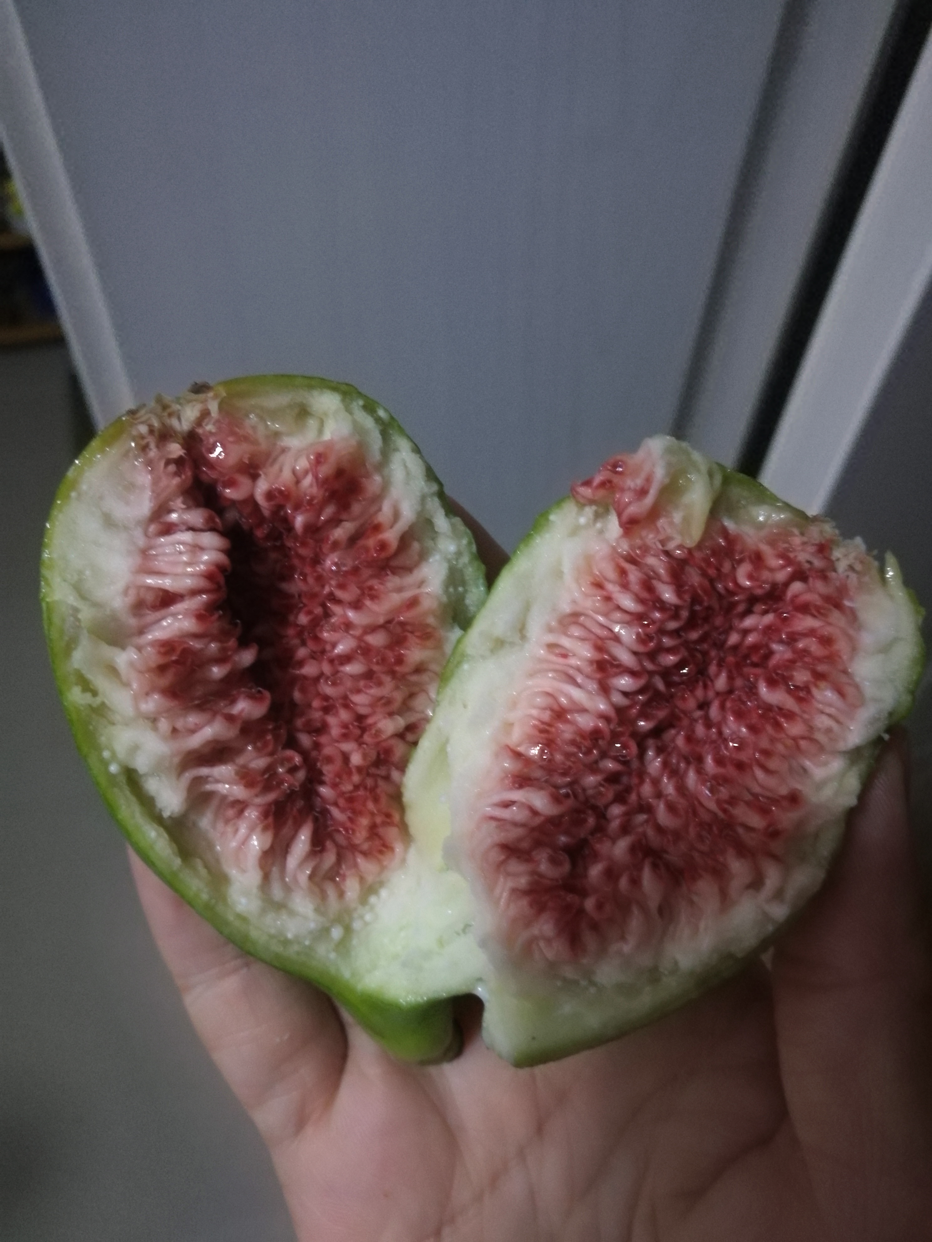无花果:乳山各个集市都会有好多摊位卖无花果,青色的果皮,与我们河北的紫色无花果不同,直到成熟果皮也是绿色的。这里的无花果很便宜2元左右一斤,个大的一斤十个左右。长的成熟的稍软一些,聚成熟的会在顶端开裂露出些许的果肉,这样的摘下来马上就吃非常甜。但在集市上大家都不会选择开裂的果子,因为不卫生也不容易保存。无花果掰开里面是红色的、密密麻麻堆挤在一起的果肉,非常成熟的除去果肉就只剩薄薄的一层果皮,不太成熟的在绿色果皮里会有一层白肉吃起来会有些涩。去年姐姐从山东回唐山给我们带回了一盒无花果,今年吃到了老乡当天摘下来的味道果然不同。