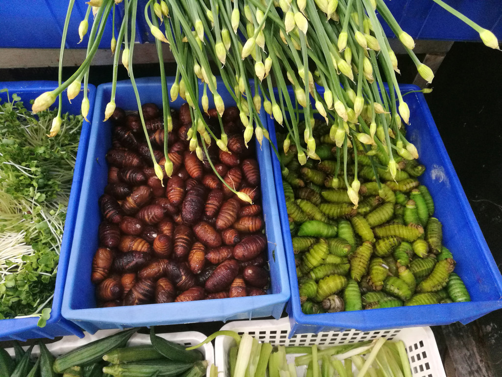 茧蛹:这个东北人的最爱,今年在山东的集市上随处可见。绿色的、棕色的大肉茧趴在货台上蠕动,没见过的估计大多数不敢相信它会是一道美味。一斤30元左右,炒着吃、炸着吃都行,高蛋白。
