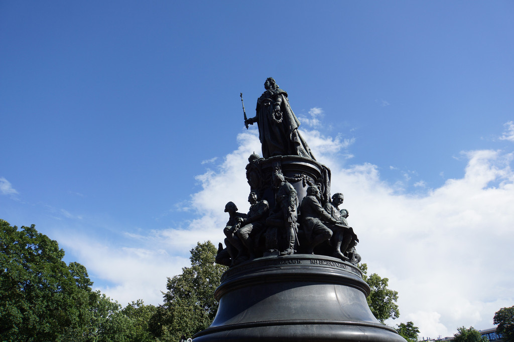 修造于1710年的涅瓦大街被称为世界最美的街道之一,街道宽阔整齐.路旁建筑整齐划一,每栋建筑都可以堪称艺术精品.但是俄罗斯的商店不知是不是由于冬天寒冷的原因,都没有漂亮的大橱窗,只有一个小门推门进去,我们又不认识俄文,也搞不清那些建筑是商店,那些不是,再说也不需要买什么东西,所以商店基本没逛.沿着大街溜达,来到了奥斯特洛夫斯基广场, 广场中央建有叶卡捷琳娜二世铜像, 底座上雕刻着当时侍奉女皇的九位贵族.由于时间原因,我们本次未能去叶卡捷琳娜宫参观,不想在此瞻仰到这位声名显赫的女沙皇.广场后面是建于1832的亚历山大德里娜剧院,此时好像正在上演芭蕾舞.我们在广场边的长椅上休息,广场上百花争艳,当地人带着孩子,牵着狗在花园中休闲.