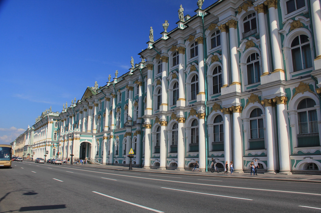 随后,我们去了此行的最重要的参观地点,冬宫,又称艾尔米塔什博物馆,是世界四大博物馆之一,与巴黎的卢浮宫、伦敦的大英博物馆、纽约的大都会艺术博物馆齐名。四角形的建筑宫殿里面有内院,三个方向分别朝向皇宫广场、海军指挥部、涅瓦河.说来好笑,昨天自由活动时,我们沿着涅瓦河闲逛,看见一排蓝色的建筑上面满是雕塑,整个建筑巍峨壮观,就拍了不少照片,回来一问导游,原来就是大名鼎鼎的冬宫.这个博物馆藏品异常丰富,因此如果想要走遍所有全部展厅,恐怕花上一个月的时间都不够,而我们只有一个小时时间,戴着耳麦,跟着导游一路狂奔,冬宫里的人实在太多了,和夏天的布达拉宫有一拼,如此拥挤的情况下,是无法欣赏艺术品的。我能记得的就是这个馆藏有很多举世闻名的绘画作品,比如达·芬奇存世作品只有十幅,冬宫就拥有两幅。还有拉斐尔的名作《科涅斯塔比勒圣母》和《圣家族》。绘画之外的我还能记得的就是米开朗基罗的雕塑《蜷缩成一团的小男孩》.希望有机会能再去俄罗斯仔细看看这些藏品.