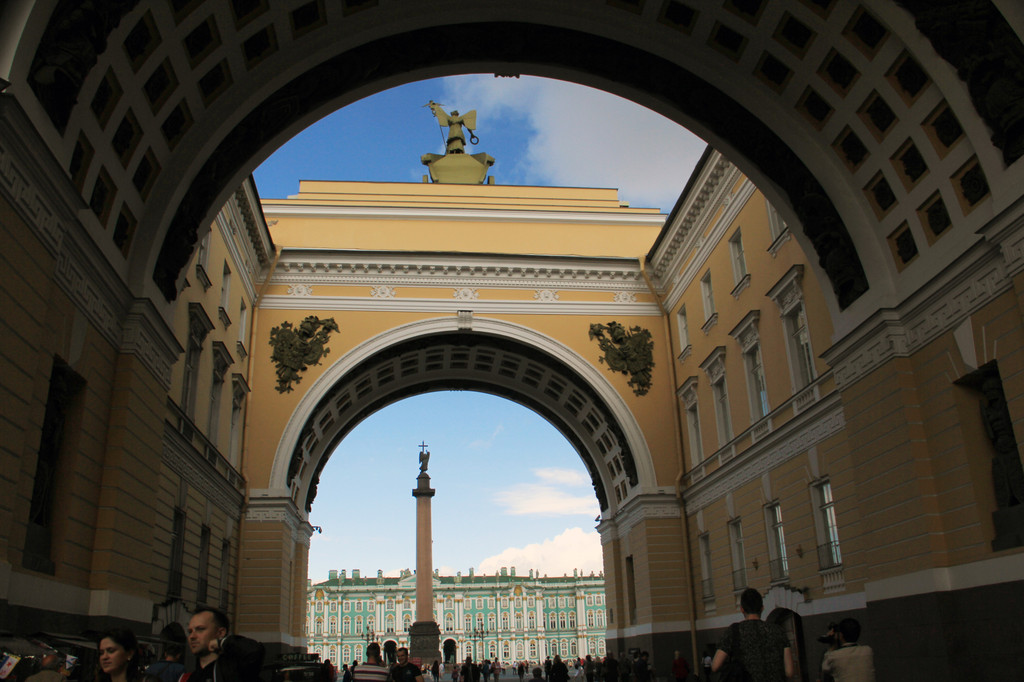 青铜骑士旁边就是沙俄时期的海军总部,。整个大厦非常气派,有56座大型塑像、11幅巨型浮雕和350块壁画装饰。类似于凯旋门的拱形六门上装饰有以海洋及俄罗斯海军为主题的各种雕像及半浮雕,正门两侧摆放着两组名为海神的庞大雕像群.从这座建设于17世纪的奢华大厦可以窥视曾经强大的波罗的海舰队和黑海舰队.