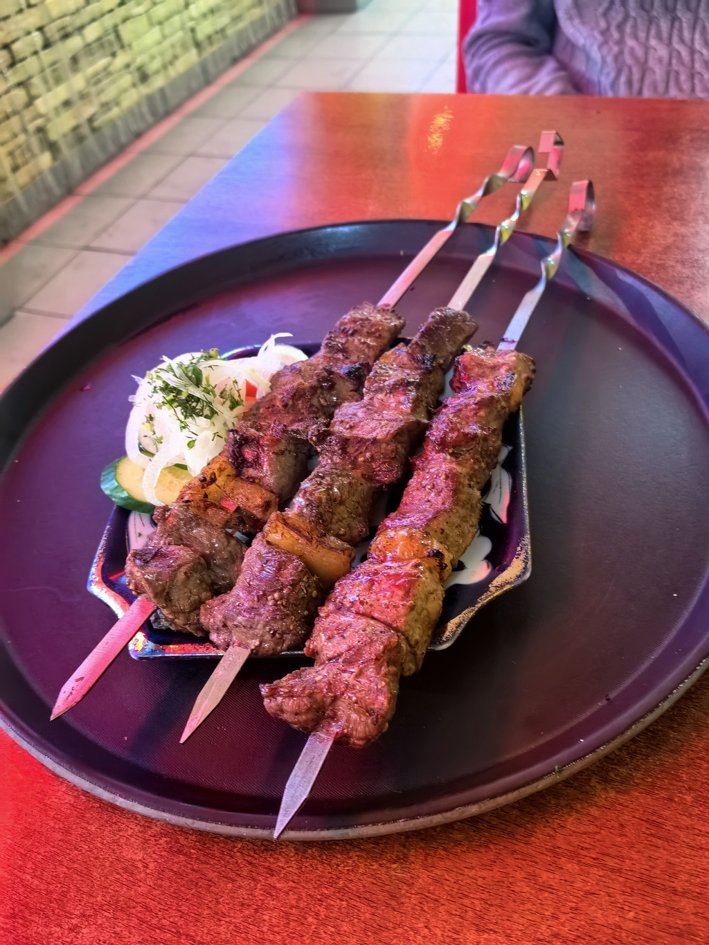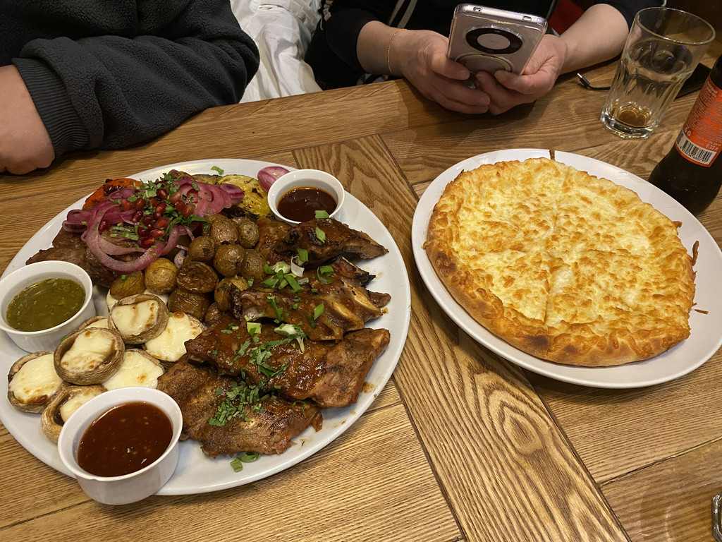 晚餐是在红场附近的Реберная №1餐厅吃的,点了一个烤肉拼盘,里面有肋排、蘑菇、土豆等,分量足,配了类似披萨的饼,以及樱桃味的啤酒,那种啤酒果汁混合的口味。