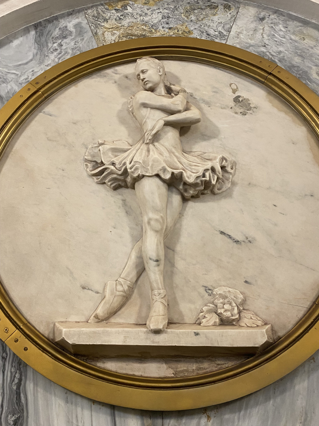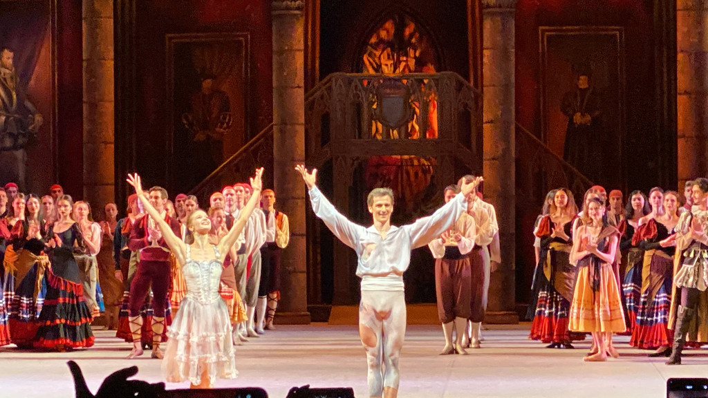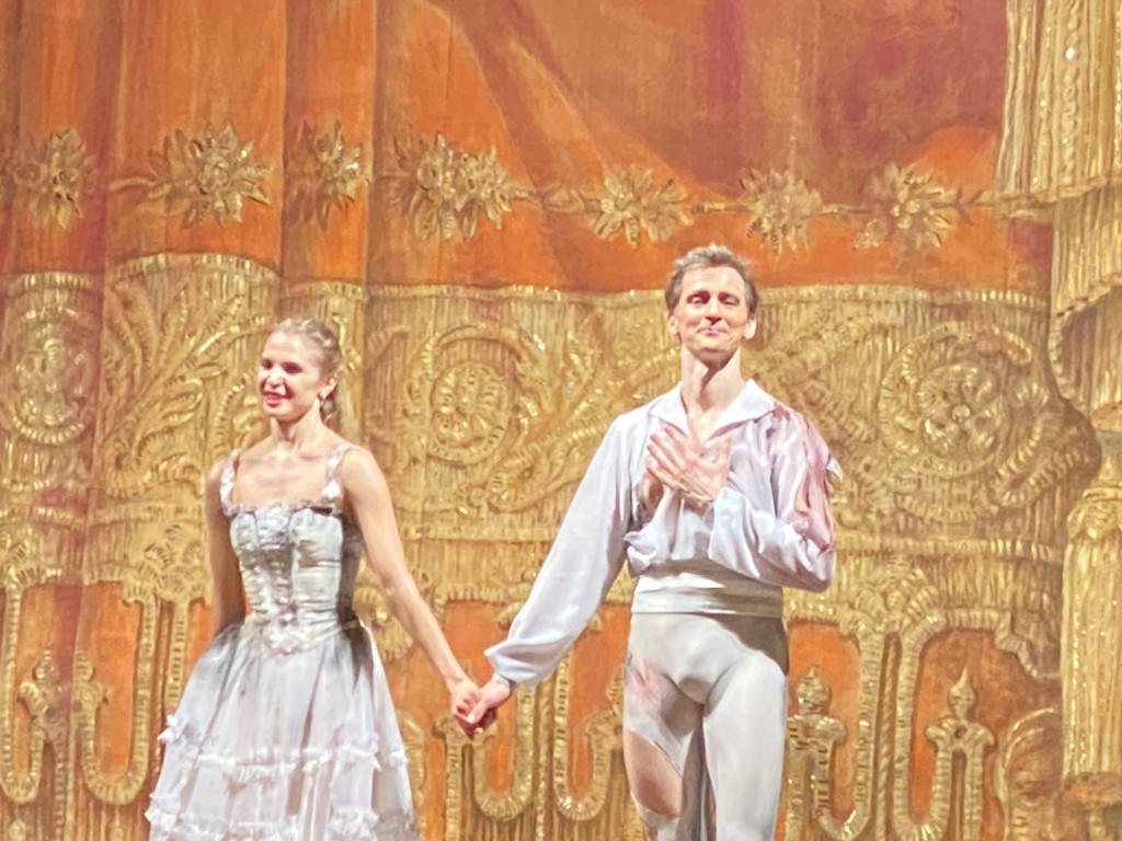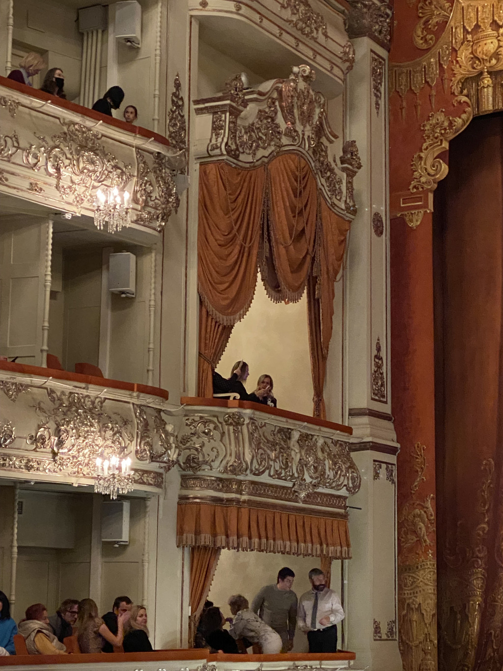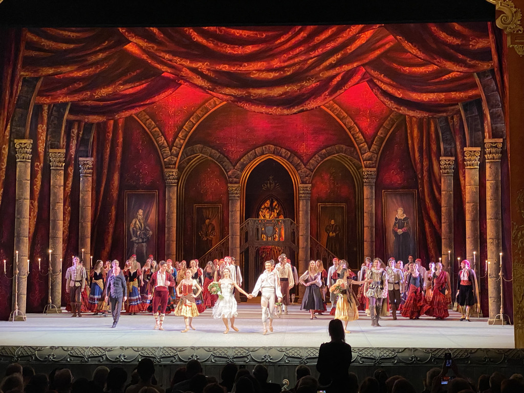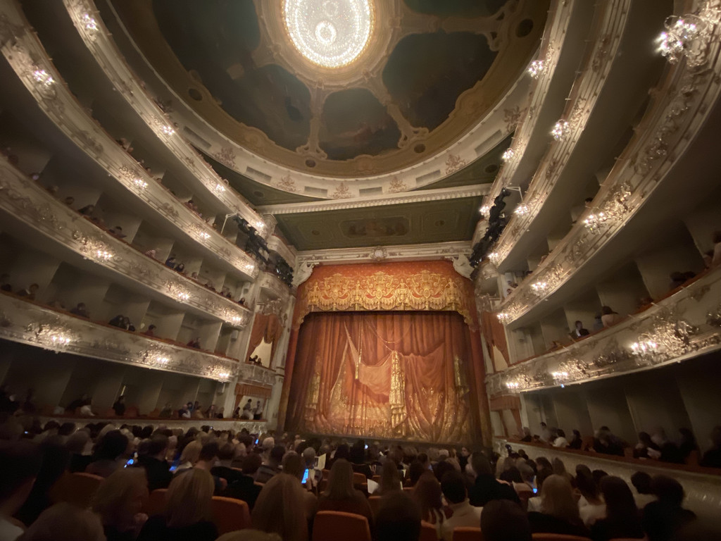 晚餐我们是在汉堡王用的,这也是在俄罗斯为数不多的欧美尚未撤牌的快餐连锁品牌,点餐付款都是在电子屏前自助的,正当我们对屏面上的俄文一筹莫展时,有一当地女孩主动教我们可以切换到中文,点了双层牛肉汉堡、薯条、奶昔、咖啡等,刷卡结账后吐出来一张收银条,上面有取餐号,在一旁等餐,十分钟左右出餐,其中的双层汉堡特别大特别厚,总体价格不贵,三个人只吃了2400多卢布。晚上7点,我们去米哈伊洛夫斯基剧院观看芭蕾舞剧《劳伦西亚》。从19世纪下半叶开始,俄罗斯逐渐成为世界芭蕾的中心,并一直在芭蕾史上占有重要地位,因此,芭蕾舞是去俄罗斯必看的演出之一。剧院就在滴血教堂的旁边,剧院内部装修很有年代感,类似上世纪80年代国内的剧场。进剧场先存衣再入座,剧场并不大,一层,侧面有包厢,座位也没有梯度,我们所坐的大厅最后一排旁边还有几个加座。《劳伦西亚》取材于著名剧作家洛佩·德维加的剧本,故事发生在西班牙,主题是暴君指挥官强抢羊泉村村长女儿劳伦西亚,残害村民,最终人民反抗起义战胜暴君的故事。舞台上,无论是男女主角、配角还是群演,都展现了芭蕾舞的精湛技艺,表演还融合了民间舞蹈在其中。演出分上下半场,各45分钟,中间休息半小时,观演期间不能摄影摄像,每当舞者跳出旋转、托举等高难度的动作时,全场掌声雷鸣,甚至叫好。演出结束后,演员多次返场谢幕,观众更是全体起立,掌声久久不息,可见俄罗斯民众对芭蕾艺术的喜爱和理解之深。