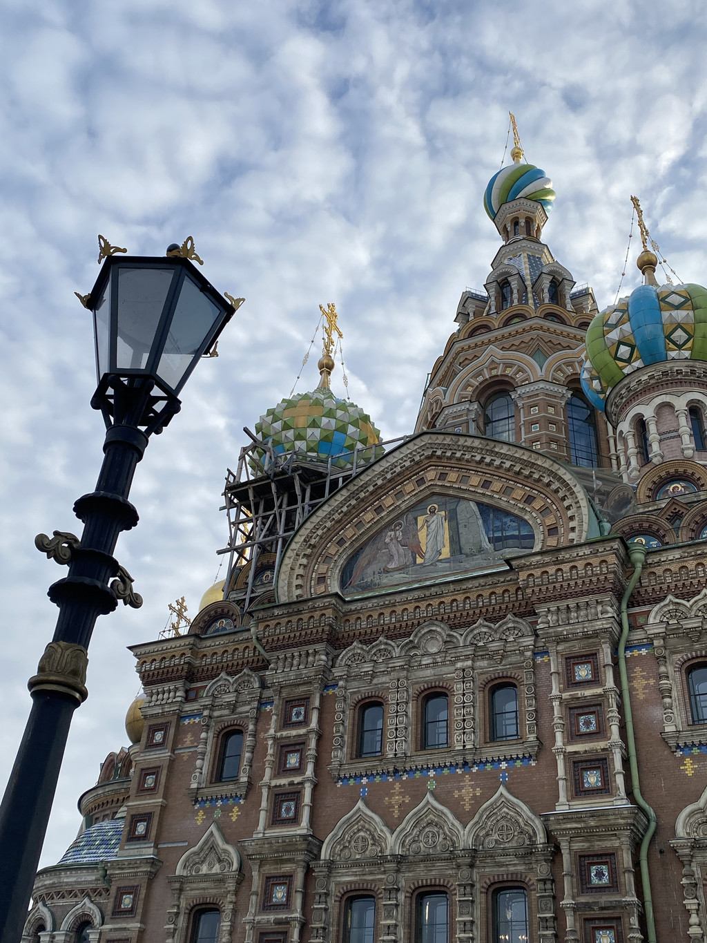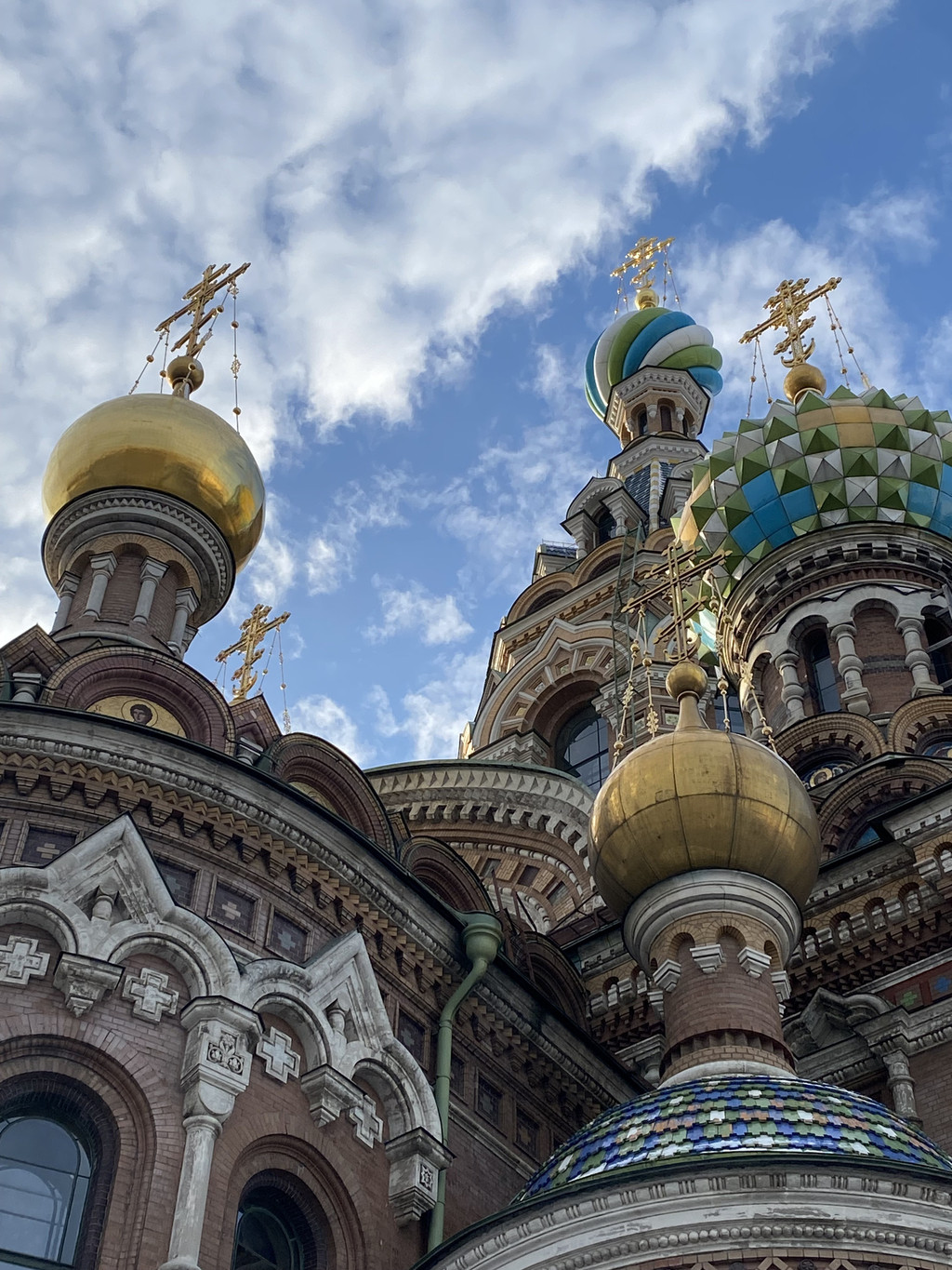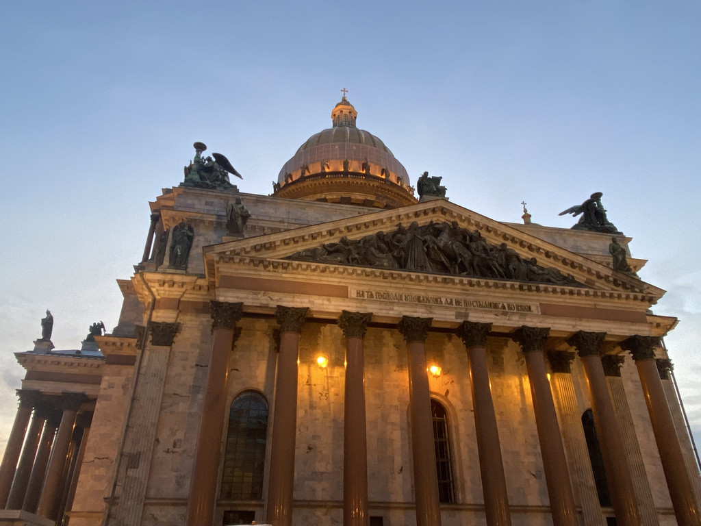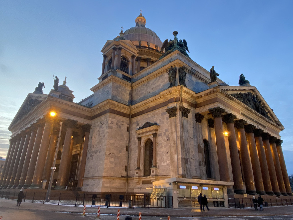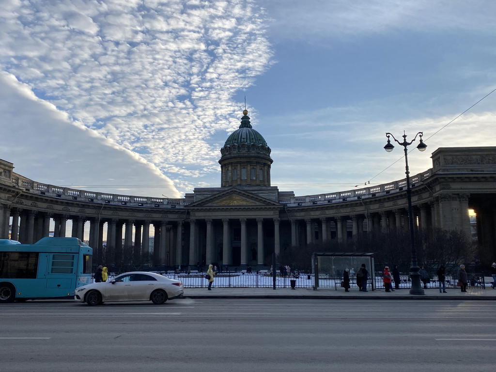 百年书店的对面就是喀山大教堂,教堂以罗马圣彼得大教堂为原本,平面设计呈十字型,中间上方是一个圆筒型的顶楼,顶楼上是一个端正的圆顶。教堂门前是一广场,矗立着一俄国陆军元帅纪念碑,广场被教堂的面向涅瓦大街的94根柱廊呈半圆型环抱,巍峨庄重。进入教堂,空间非常高大,以柱列分隔的长形主堂高大宽敞,中央穹顶辉煌华丽,教堂专为存放俄罗斯东正教的重要圣物——喀山上帝之母圣像。俄罗斯人信奉东正教,进入教堂前先比划十字,教堂内的圣像和圣画前都有教徒在祈祷,还有教徒排队请圣物。圣彼得堡有三个著名的大教堂,除了喀山教堂外,还有滴血教堂和圣以撒教堂。教堂间的距离都不远,步行即可到达。滴血大教堂的正式名称是基督复活大教堂,旁边紧邻运河,之所以叫“滴血”,是因为沙皇亚历山大二世遇刺身亡,血洒此地,亚历山大三世为纪念亡父,在此修建了这个教堂。教堂的外形呈现中世纪俄罗斯建筑风格,教堂的穹顶有的是金色,有的呈蓝、绿、黄色相间,穹顶的表面有的是榴莲样的凸起,有的是钻石样的凸起,色彩缤纷、形状多样。据说教堂内部装饰有超过7500平方米的马赛克,是世界教堂之最,可惜我们去的时间晚了,教堂已停止售票。教堂旁还有一个公园,许多鸽子在此栖居和觅食。圣以撒大教堂是圣彼得堡最大的东正教教堂,102米的高度也是世界上最高的圆顶建筑,被誉为世界四大圆顶教堂之一。从远处就能感受到其金光闪闪的“洋葱头”圆顶的璀璨光芒,据说镀金达100公斤。教堂的四面各矗立着16根巍峨的石柱,双排而立,共同托起精雕细琢的山墙,外墙采用灰色大理石贴面,庄重沉稳。同样是因为时间晚了,没能入内参观,据说教堂里面空间宽敞,能容纳1.2万人,内饰使用了大量宝石,金碧辉煌,43米高的廊柱上是一观景台,可以一览涅瓦河的美景。