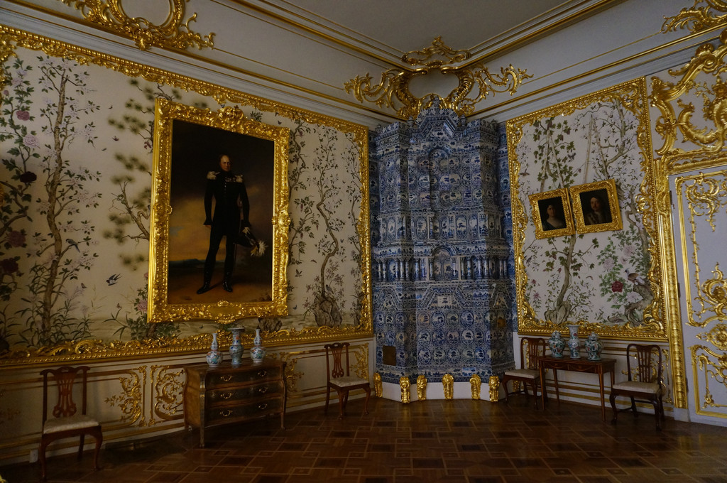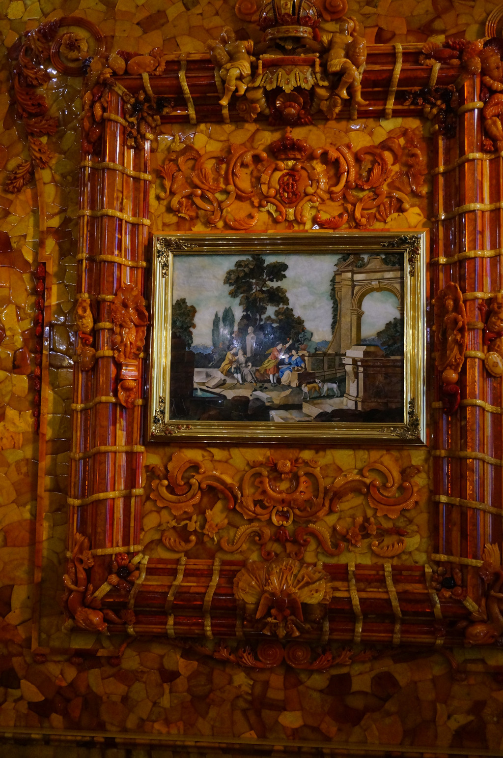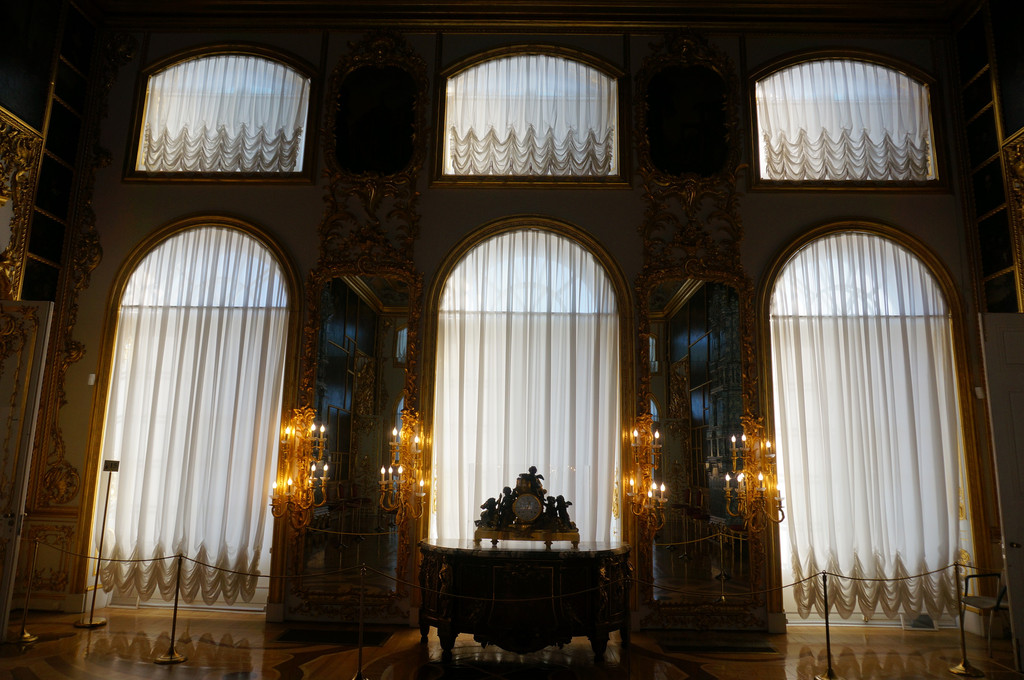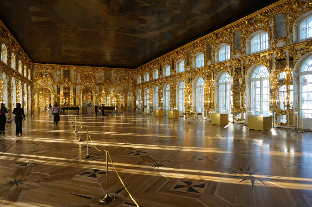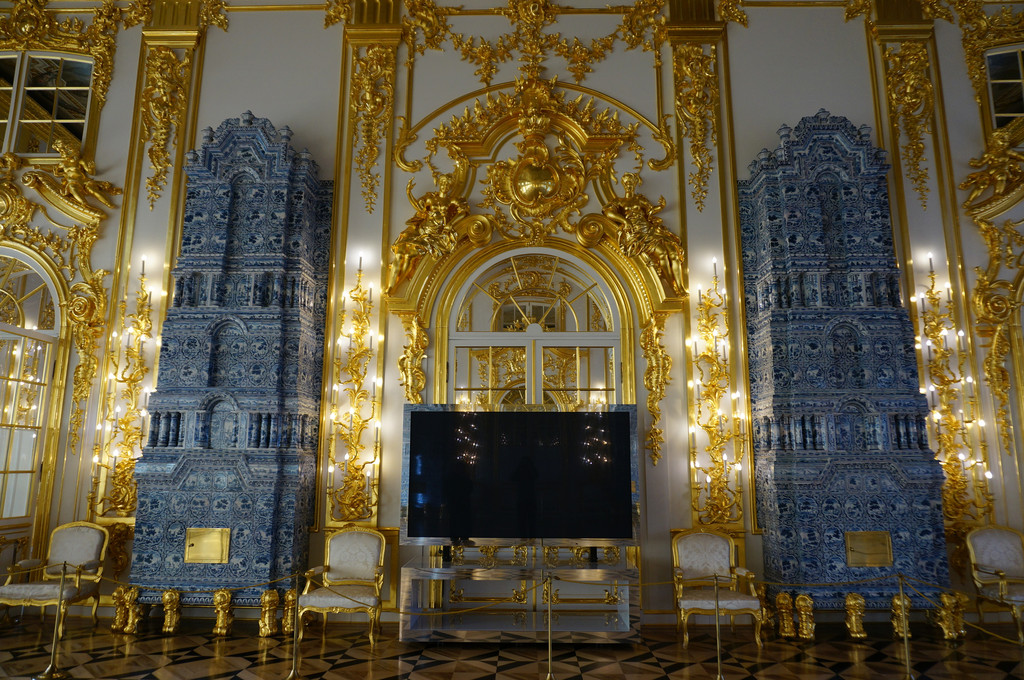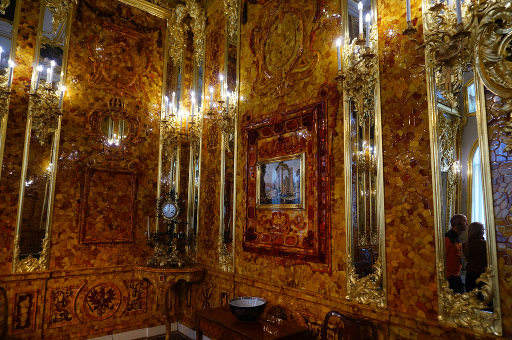 进宫有两道门禁,室外的无人看守,自行扫电子票的二维码进,但要注意不能超过预约时间15分钟,进去后存衣存包组讲解器穿鞋套后再通过室内的闸机刷码后才算正式入场。宫殿可供参观的部分主要在二层,主楼楼梯上去后先从右手顺序浏览参观,一个接一个富丽堂皇的充满巴洛克风格的厅室相连,每个厅都有具体的功能,用作皇家成员接待、用餐、休息、娱乐等的场所。其中,大厅(光明走廊)是最大的厅,800平米左右,是伊丽莎白女皇在位期间用于接待重要来宾、宴会、舞会的场所,厅内通过镜子和窗交替组合形成光亮通透的视觉感,并且在墙上使用了镀金雕花,大概耗费了100kg左右的黄金,这种镀金雕花是在一种名为菩提木的材质上雕刻,再用石膏覆盖,最后镀金形成。宫殿中最出名的厅莫过于琥珀宫了,琥珀宫是1716年由普鲁士国王送给俄罗斯沙皇彼得大帝的礼物,墙面镶嵌有6吨多的琥珀和名贵珠宝,闪耀着从柠檬黄到金红色,辉煌得令人窒息,被列为世界第八大奇迹。二战期间,琥珀宫被纳粹洗劫一空,直至2003年纪念圣彼得堡建市300周年的时候,才由俄罗斯能工巧匠重新复原出了当时的面貌。这一复原工程历时25年,耗资1100万美元。叶宫内还收藏了大量名贵的油画、雕塑、艺术品和皇室用品,展现了俄罗斯帝国时期的艺术成就。