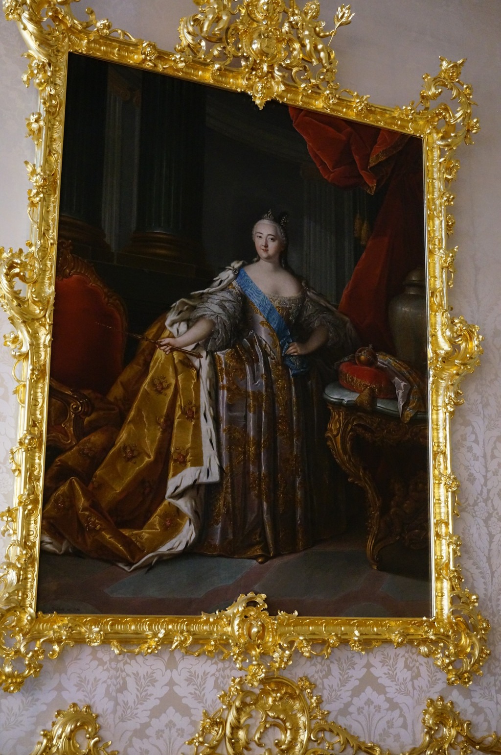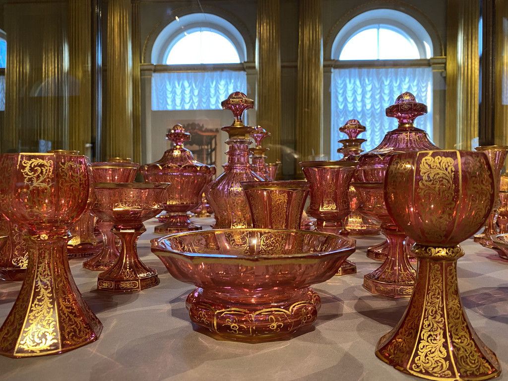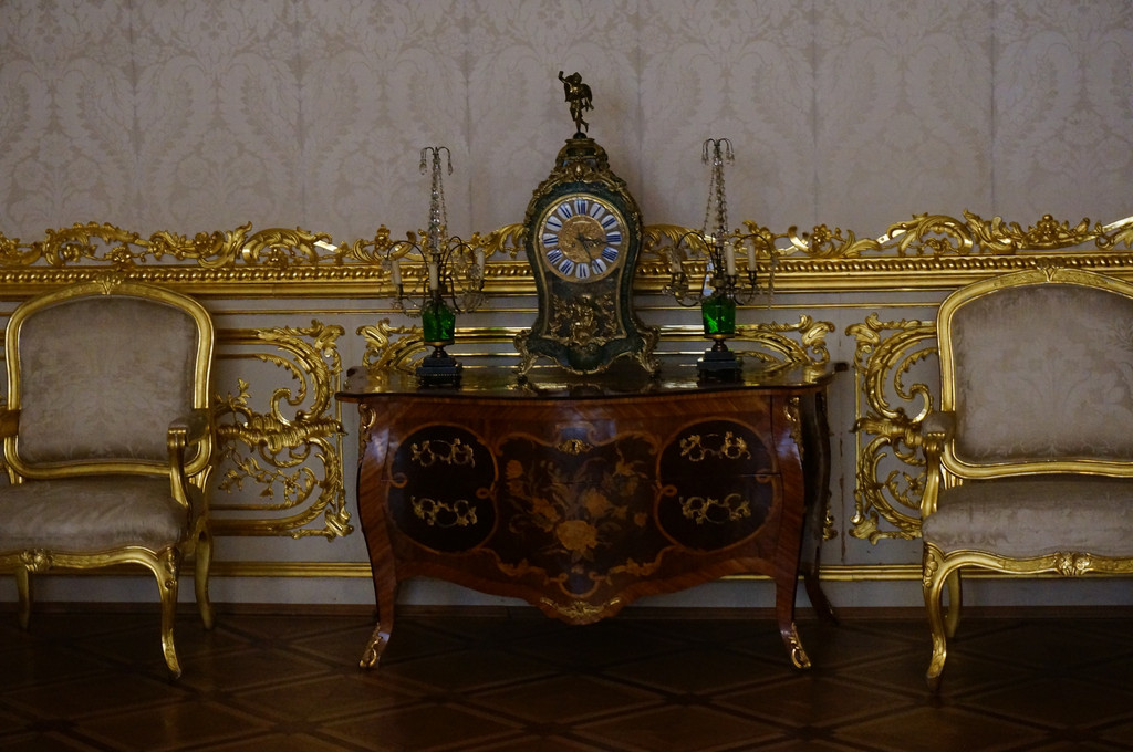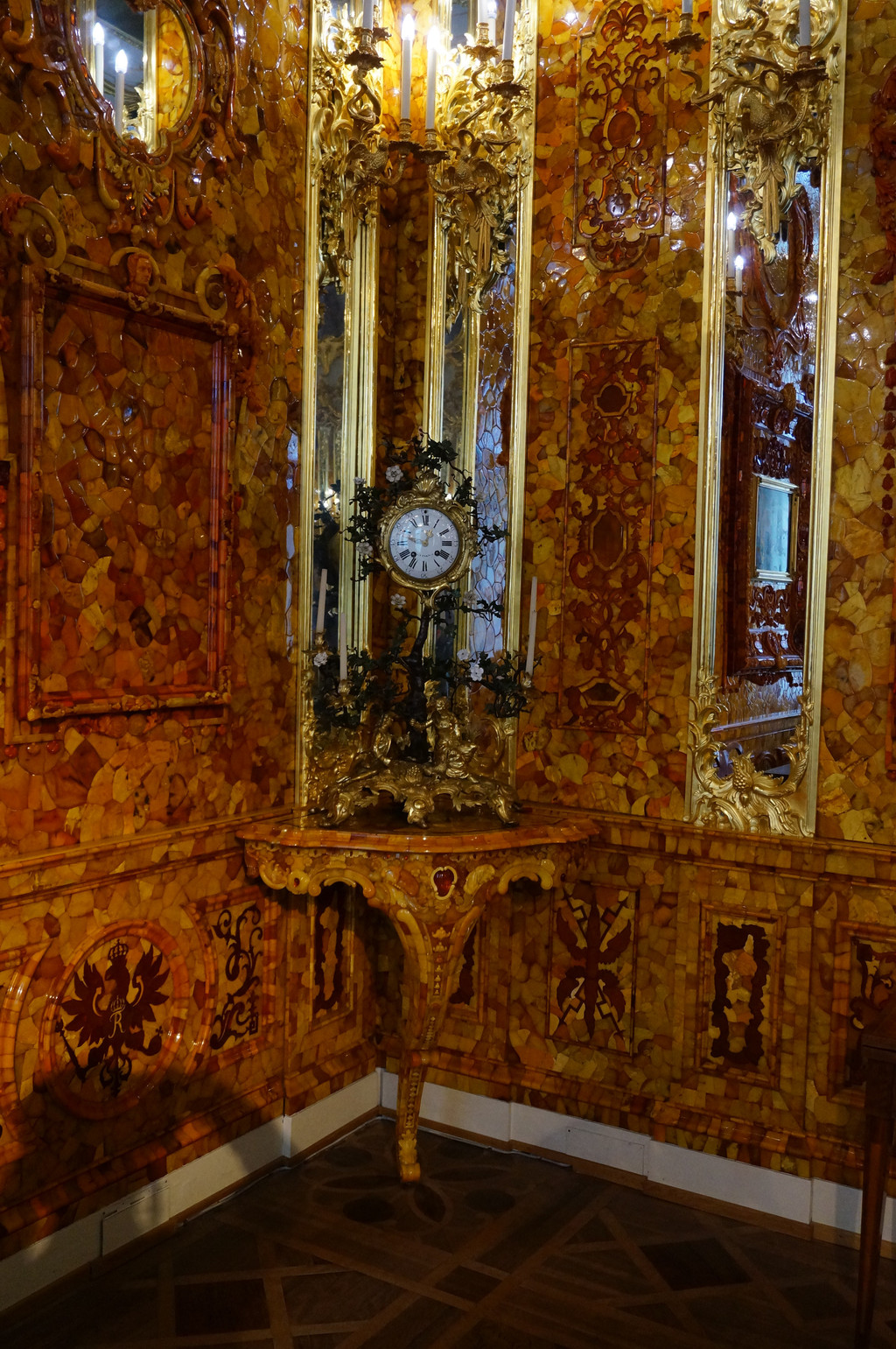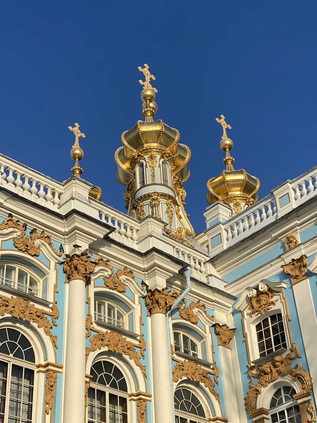 进宫有两道门禁,室外的无人看守,自行扫电子票的二维码进,但要注意不能超过预约时间15分钟,进去后存衣存包组讲解器穿鞋套后再通过室内的闸机刷码后才算正式入场。宫殿可供参观的部分主要在二层,主楼楼梯上去后先从右手顺序浏览参观,一个接一个富丽堂皇的充满巴洛克风格的厅室相连,每个厅都有具体的功能,用作皇家成员接待、用餐、休息、娱乐等的场所。其中,大厅(光明走廊)是最大的厅,800平米左右,是伊丽莎白女皇在位期间用于接待重要来宾、宴会、舞会的场所,厅内通过镜子和窗交替组合形成光亮通透的视觉感,并且在墙上使用了镀金雕花,大概耗费了100kg左右的黄金,这种镀金雕花是在一种名为菩提木的材质上雕刻,再用石膏覆盖,最后镀金形成。宫殿中最出名的厅莫过于琥珀宫了,琥珀宫是1716年由普鲁士国王送给俄罗斯沙皇彼得大帝的礼物,墙面镶嵌有6吨多的琥珀和名贵珠宝,闪耀着从柠檬黄到金红色,辉煌得令人窒息,被列为世界第八大奇迹。二战期间,琥珀宫被纳粹洗劫一空,直至2003年纪念圣彼得堡建市300周年的时候,才由俄罗斯能工巧匠重新复原出了当时的面貌。这一复原工程历时25年,耗资1100万美元。叶宫内还收藏了大量名贵的油画、雕塑、艺术品和皇室用品,展现了俄罗斯帝国时期的艺术成就。