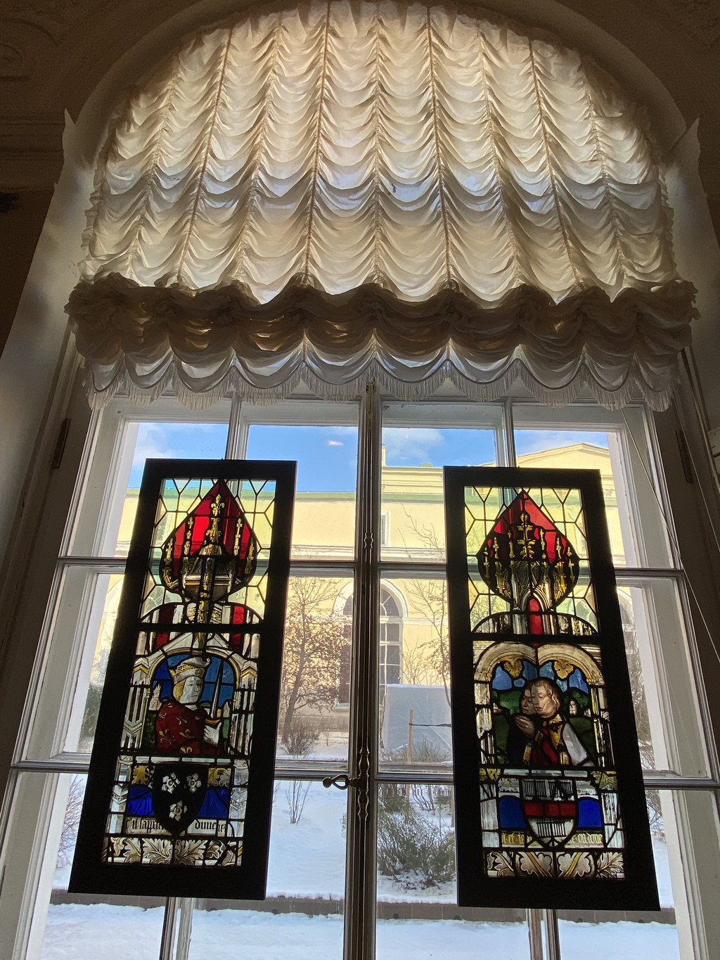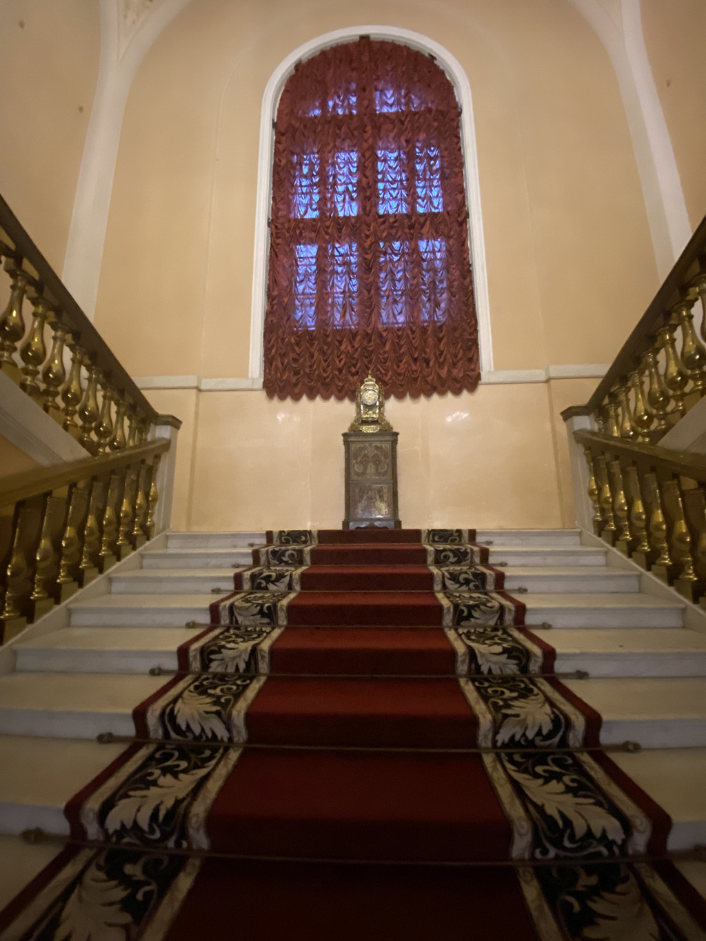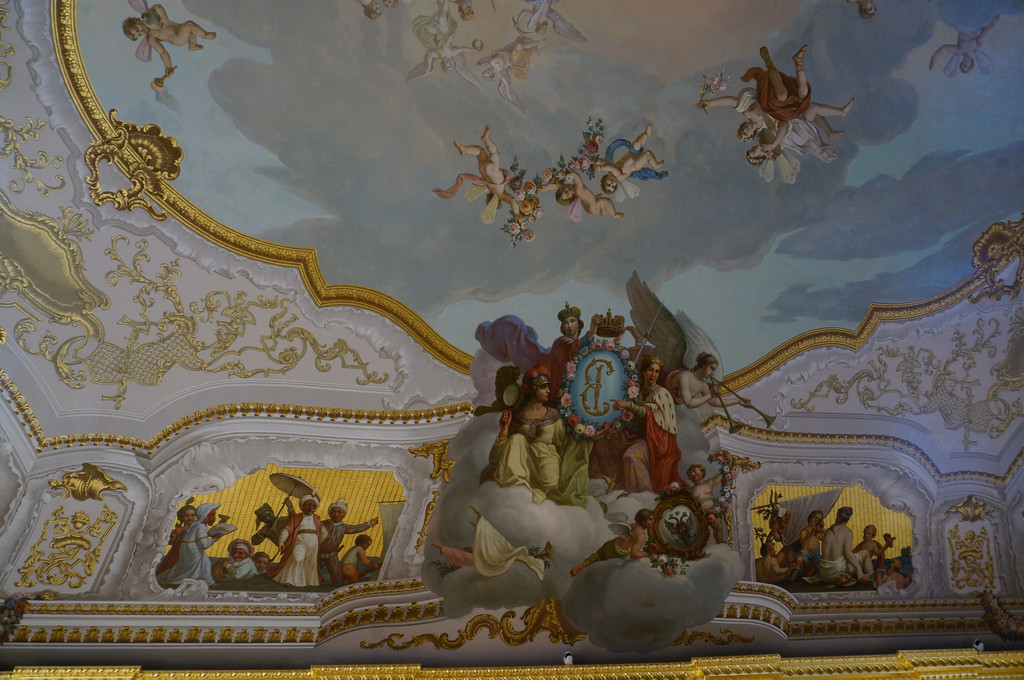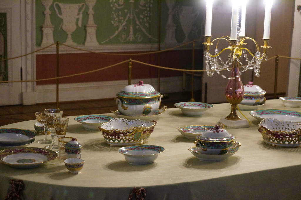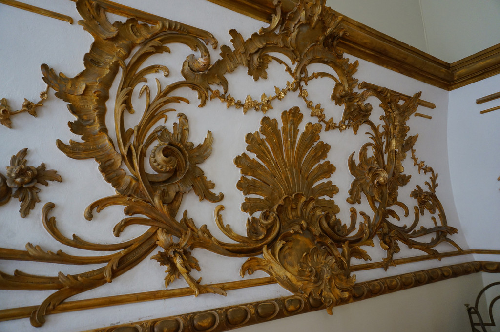 进宫有两道门禁,室外的无人看守,自行扫电子票的二维码进,但要注意不能超过预约时间15分钟,进去后存衣存包组讲解器穿鞋套后再通过室内的闸机刷码后才算正式入场。宫殿可供参观的部分主要在二层,主楼楼梯上去后先从右手顺序浏览参观,一个接一个富丽堂皇的充满巴洛克风格的厅室相连,每个厅都有具体的功能,用作皇家成员接待、用餐、休息、娱乐等的场所。其中,大厅(光明走廊)是最大的厅,800平米左右,是伊丽莎白女皇在位期间用于接待重要来宾、宴会、舞会的场所,厅内通过镜子和窗交替组合形成光亮通透的视觉感,并且在墙上使用了镀金雕花,大概耗费了100kg左右的黄金,这种镀金雕花是在一种名为菩提木的材质上雕刻,再用石膏覆盖,最后镀金形成。宫殿中最出名的厅莫过于琥珀宫了,琥珀宫是1716年由普鲁士国王送给俄罗斯沙皇彼得大帝的礼物,墙面镶嵌有6吨多的琥珀和名贵珠宝,闪耀着从柠檬黄到金红色,辉煌得令人窒息,被列为世界第八大奇迹。二战期间,琥珀宫被纳粹洗劫一空,直至2003年纪念圣彼得堡建市300周年的时候,才由俄罗斯能工巧匠重新复原出了当时的面貌。这一复原工程历时25年,耗资1100万美元。叶宫内还收藏了大量名贵的油画、雕塑、艺术品和皇室用品,展现了俄罗斯帝国时期的艺术成就。