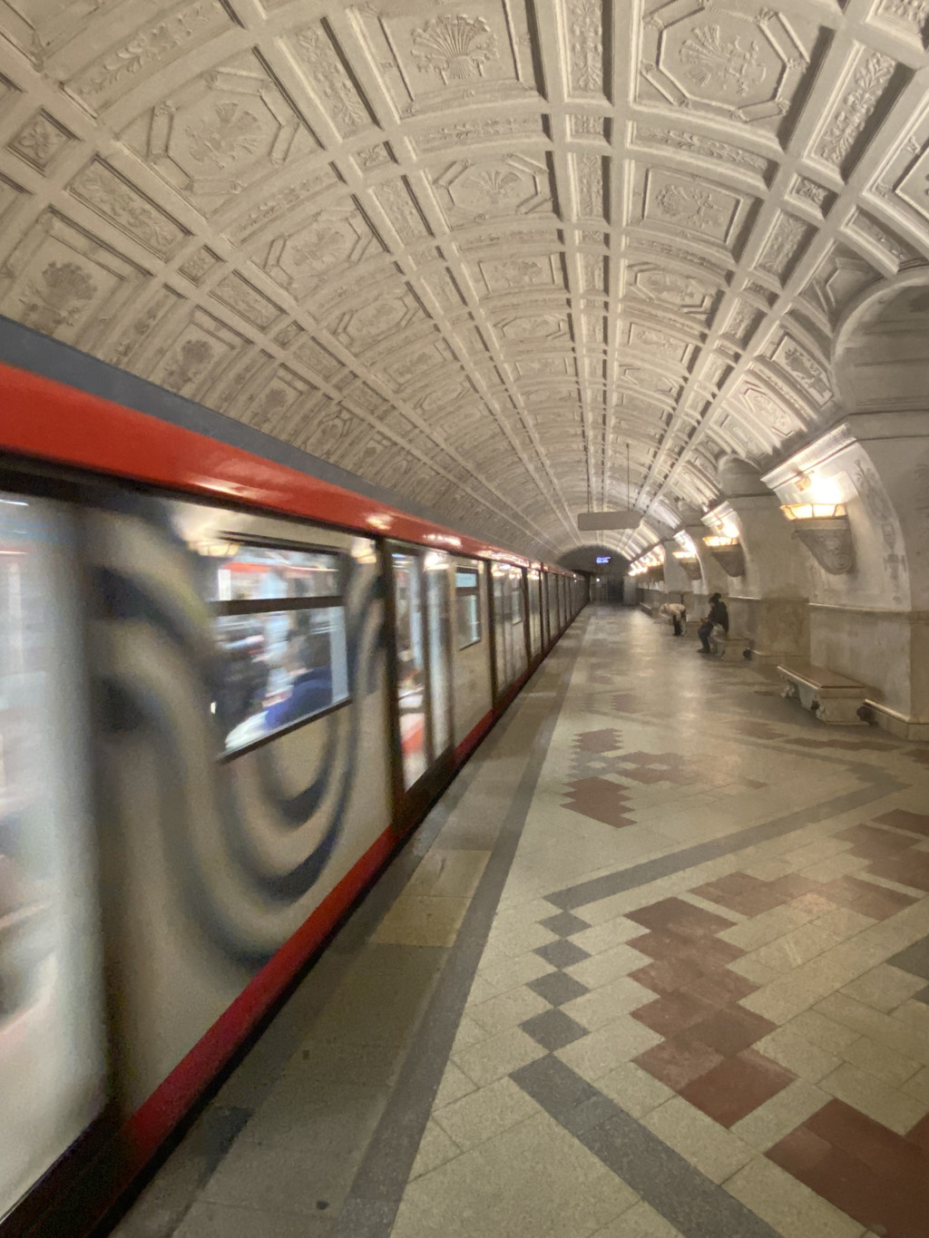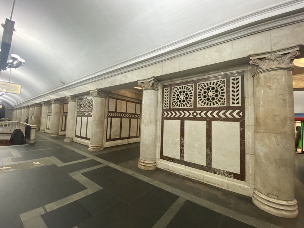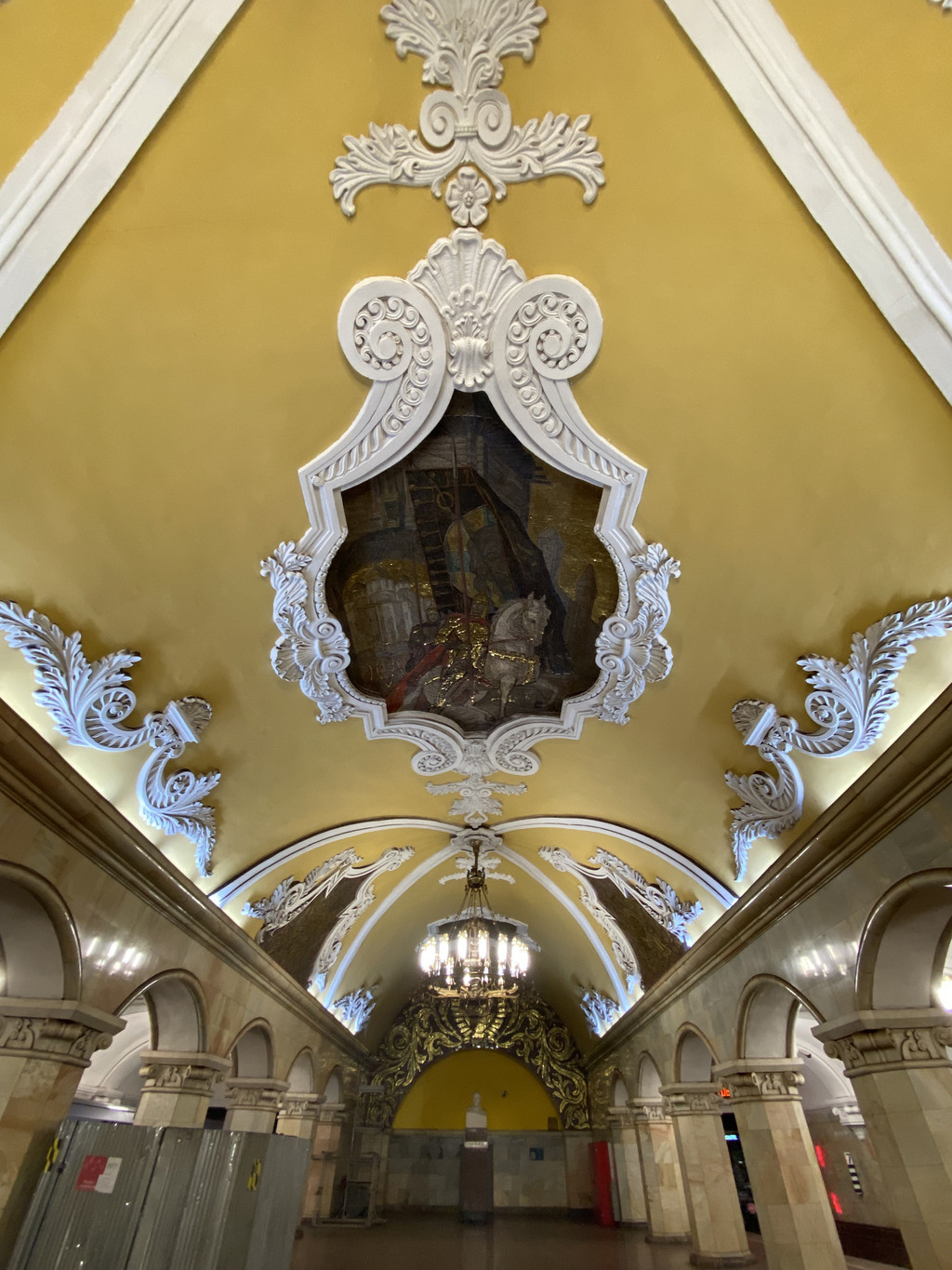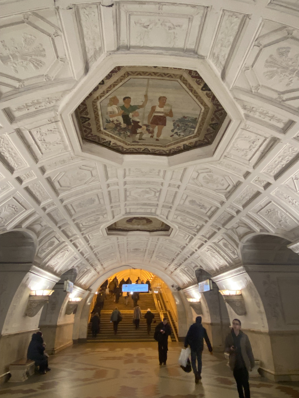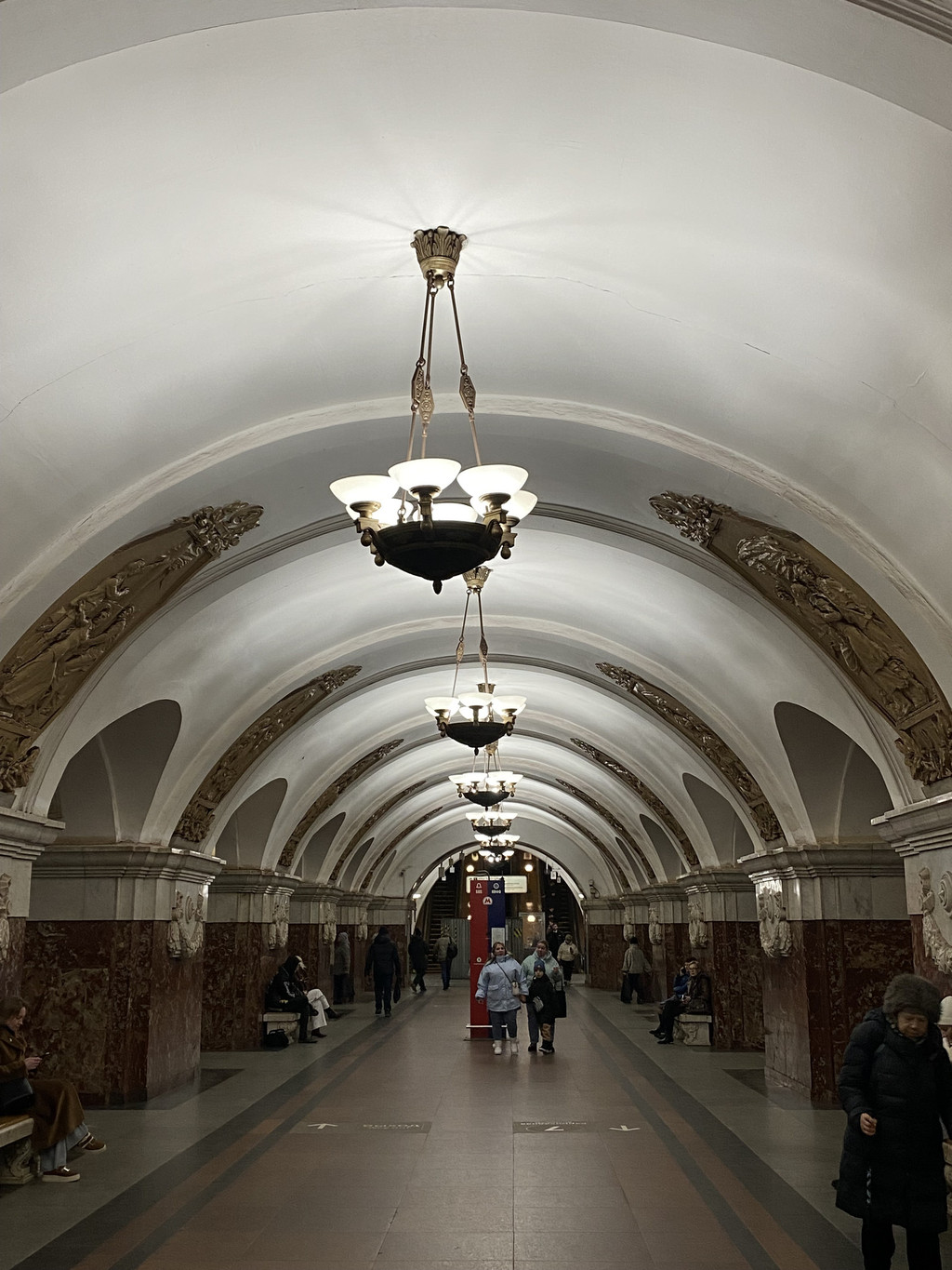 莫斯科地铁被公认为世界上最漂亮的地铁,可谓艺术圣殿,地铁站里有雕塑、壁画、时装、灯影、艺术装置等各种艺术表现,风格各异,美轮美奂。莫斯科地铁于1935年开通,运营路线长度为全球第五大,除了通行功能,还考虑了战时的防护要求,可供400余万居民掩蔽之用。地铁票分单次、一天、三天、三十天等多种票型,单次票乘坐65卢布,不论进出站点,一天票乘坐315卢布,不计次数乘坐,票可以在自助机上购买,刷卡和现金都可以。今天既然是地铁主题游,我们就买了一天票,从一号线的索科尔尼基站进站,沿着5号线的站点游览。共青团站是莫斯科地铁中最富丽堂皇的站,月台上的拱门、吊灯,顶上繁复的石膏装饰线条和壁画,浓浓的巴洛克风格,站厅里还立有一尊列宁的雕像。白俄罗斯站的顶上铺满白色的石膏浮雕图案,中间嵌着一些表现人民生活的彩石马赛克壁画,地板图案是白俄罗斯传统装修风格。基辅站的墙上排列着许多壁画,以乌克兰的独特风情为背景,表现了顿河的哥萨克、乌克兰姑娘的舞蹈,以及克里米亚和黑海的迷人景致。胜利公园站一度是世界上最深的地铁,深达97米,搭乘一条长达126米的自动扶梯,犹如进入时光隧道,需要3分钟左右到达月台,胜利公园站的大理石立体装饰是特色,大理石的装饰表现了人民文体、休闲等日常活动,雕刻栩栩如生。十月站的名字是为了纪念附近的十月广场,装饰风格致力于表现在卫国战争中战胜法西斯侵略者的胜利主题,在车站的尽头,有一个后殿,在帝国风格的仪式围栏后,顶面是代表天空的蓝色。保罗列兹站,是一座大理石打造的梦幻城堡,墙面、地面、栏杆、扶手都是厚重的大理石,对称的巴洛克柱、墙上镂空的几何造型装饰、顶部壁龛中苏联时期主题的铜制浮雕画,都给人一种历史的厚重感。马雅可夫斯基站是为了纪念苏联诗人马雅可夫斯基而命名,它的的建筑风格被归入当时的“斯大林式新古典主义”,以简约大气的墙柱式结构取代传统的塔柱式结构,并以金属和石材混搭的方式,将当时流行的装饰艺术风格推到极致。月台两侧的每座大理石拱门都镶着不锈钢。月台地面中心铺设一长条红色大理石,犹若红毯。地铁站最吸引人的地方是天花板,在若干灯饰围成的各个圆形凹顶里,中间镶嵌着苏联名画家杰伊涅卡的马赛克壁画,一个圆凹顶内一幅,共有31幅,该设计方案于1938年在纽约国际展上获得大奖,使“马雅可夫斯基”站成为世界级的地铁站。
